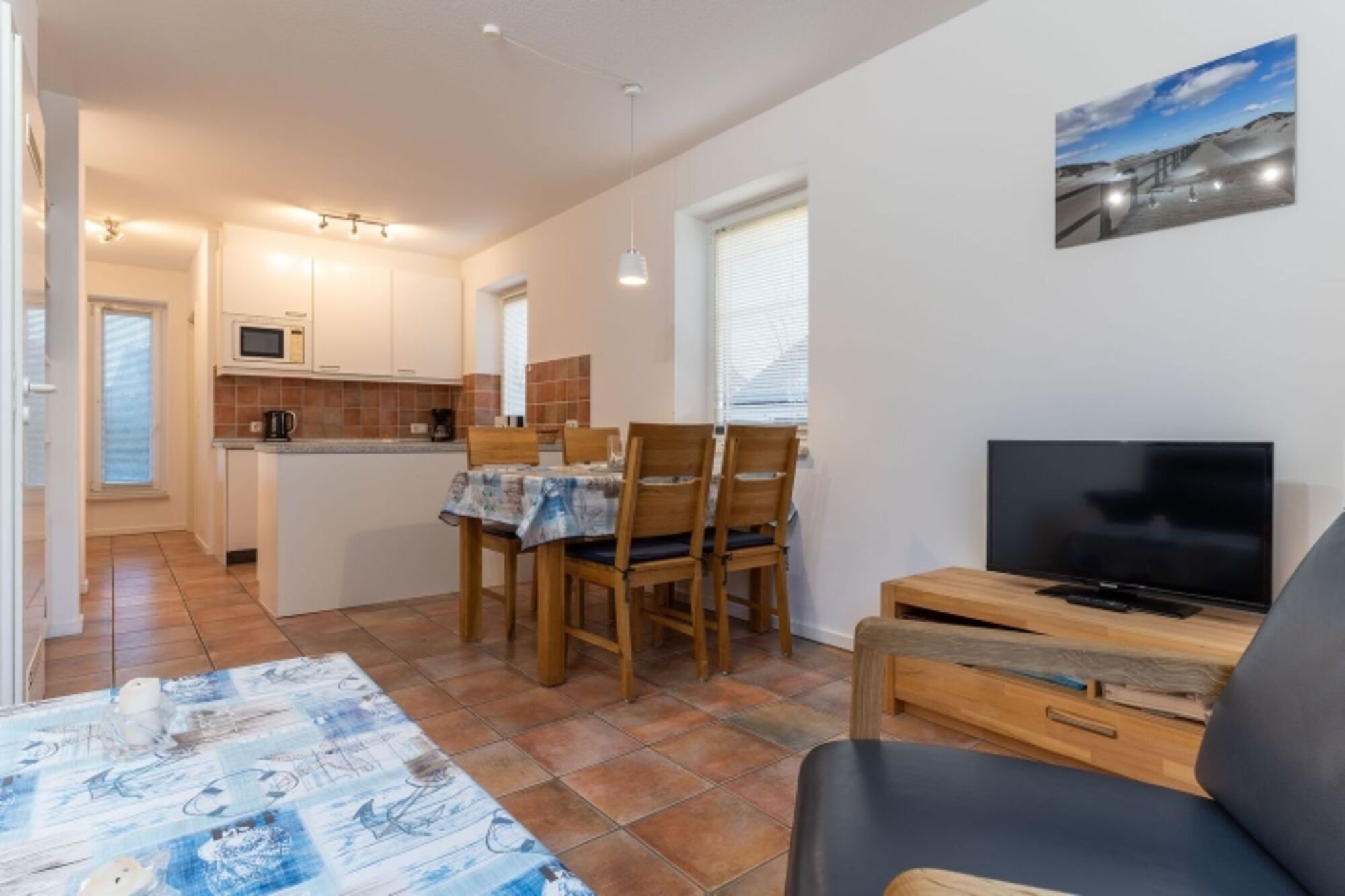 Der Wohnbereich ist durch die Essecke optisch von der offenen Küche getrennt. Dies schafft eine angenehme Atmosphäre für gemeinsames Kochen, Essen und Beisammensein. WLAN ist vorhanden.