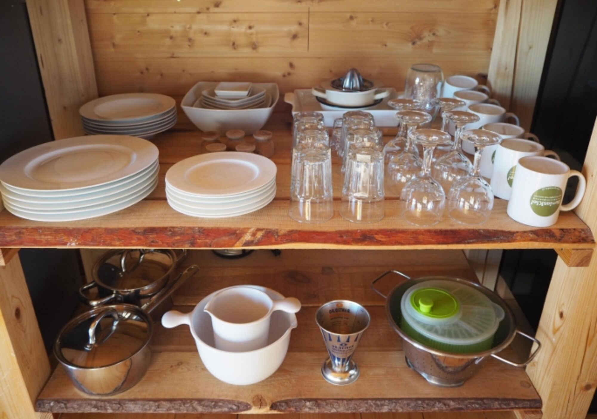 Im Parterre der beiden Cottage Apartments ist ein Duschbad mit Fußbodenheizung und eine große, offene Lounge: dort kocht Ihr mit regionalen Produkten, tafelt mit Blick ins Grüne oder macht es Euch auf der Chaiselongue für zwei vor dem gußeisernen Kaminofen gemütlich. Kaminholz ist immer reichlich in der Drewutnia, so wird es auch im Winter bei -26°C behaglich warm. Die durchdacht und stilvoll ausgestattete Küchenecke lädt zum Slow Cooking ein. Neben Kühl-/Gefrierkombi, Gasherd, Toaster, Spüle und Geschirrspüler gibt es auch altes Tafelsilber, Handquirl und verschiedene Kaffee"maschinen" samt Milchaufschäumer. Dank vieler Fenster und großen Doppelglastüren ist die Lounge lichtdurchflutet. Ihr könnt in drei der vier Himmelsrichtungen in die Natur schauen und genießt ein Gefühl, auf der Wiese zu wohnen: Rehe, Hasen, Füchse, Igel, Biber, Kraniche, Störche, Falken, Seeadler, Kröten, Frösche, Molche, leben und jagen nur wenige Meter von Euch entfernt auf dem Feld und am See.