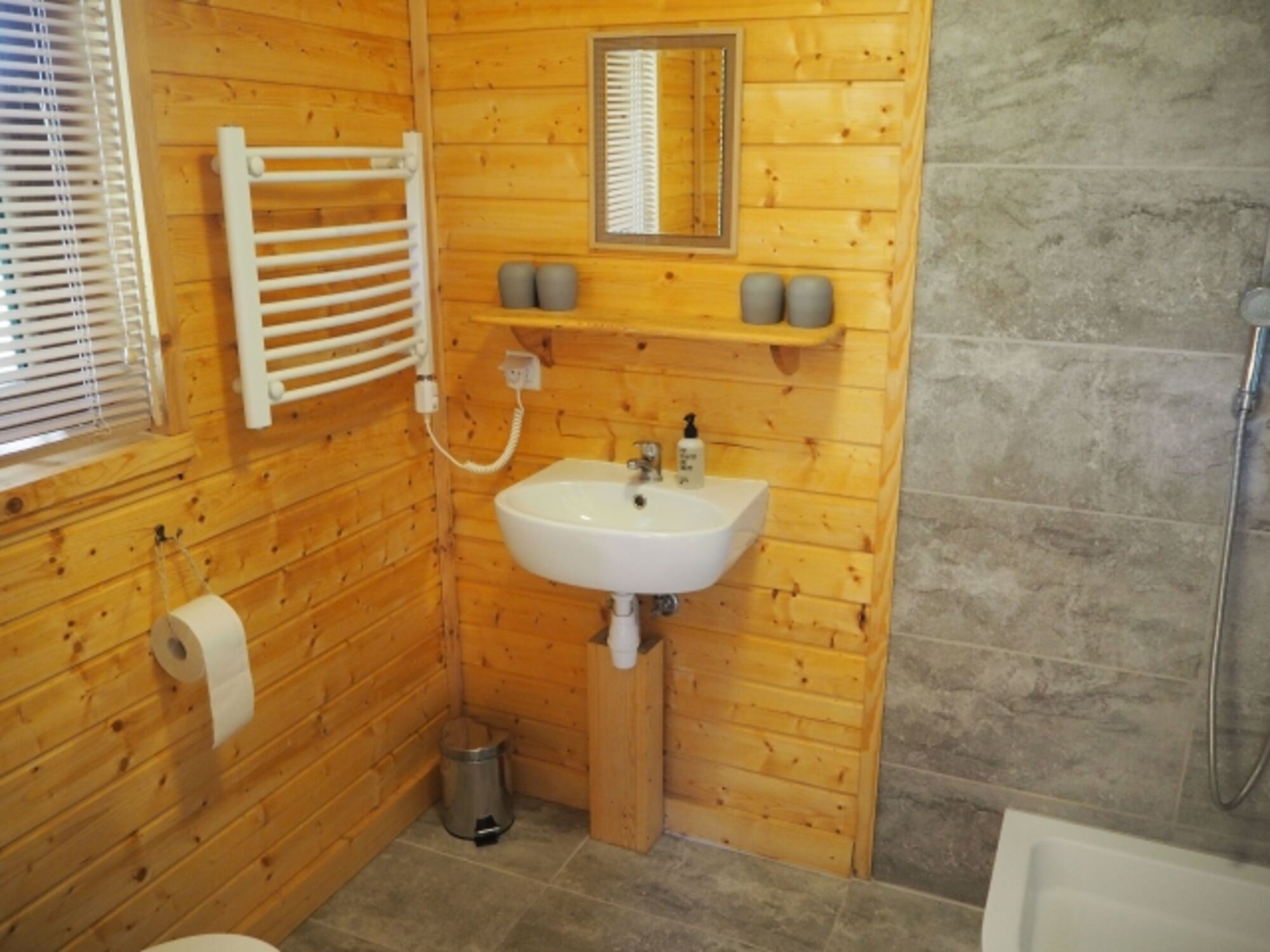 Mit behaglicher Fußbodenheizung :-) Falls Ihr Handtücher vergessen solltet: wir haben immer unbenutzte Notfallsets (Baumwolle, beige, klein & groß) da. Die könnt Ihr ggf. zum Selbstkostenpreis von EUR 9,00 erwerben und dann natürlich mit nach Hause nehmen :-) Es gibt Natur-Handseife - Shampoo & Duschgel leider nicht.