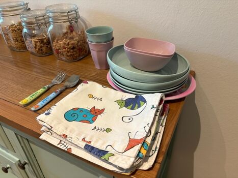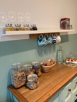 4-Platten Herd, Dunstabzugshaube, Kühlschrank mit Gefrierfach, Kaffeevollautomat, Mixer, Korkenzieher / Flaschenöffner, Gewürze (Salz, Pfeffer, Zucker), Öl / Essig, Geschirrhandtücher, Mülltüten