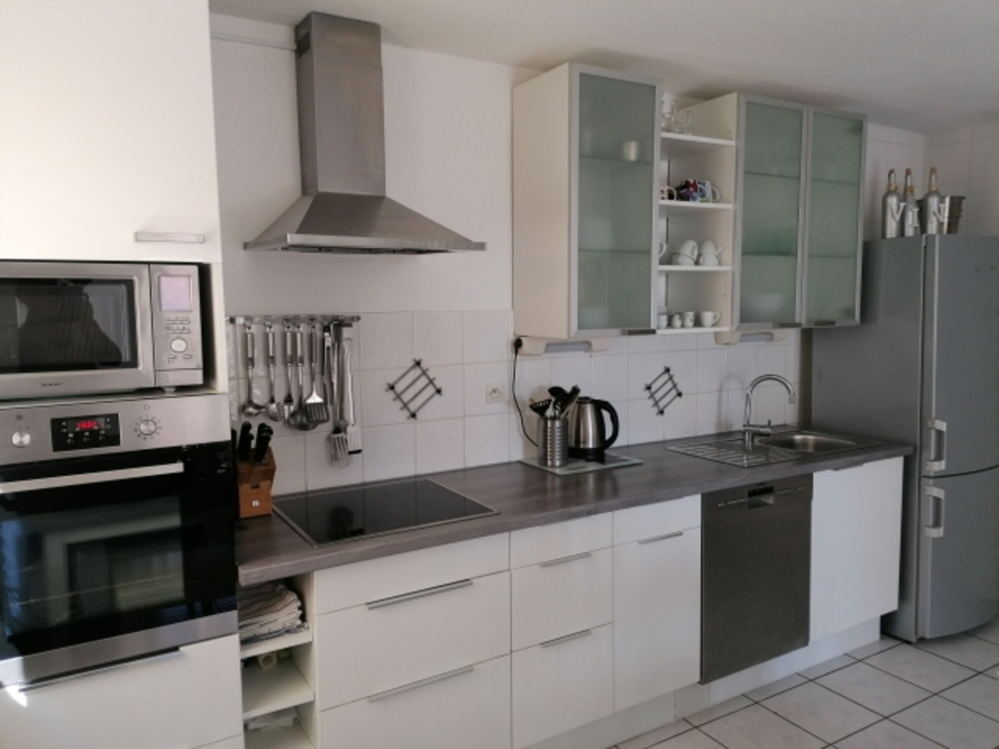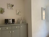 4-Platten Herd, Cerankochfeld, Dunstabzugshaube, Kühlschrank mit Gefrierfach, Gefrierschrank, Nespresso-Automat, Mixer, Elekt. Fruchtpresse, Korkenzieher / Flaschenöffner, Gewürze (Salz, Pfeffer, Zucker), Essplatz in der Küche
