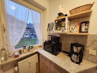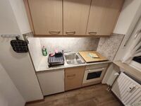Cerankochfeld, Dunstabzugshaube, Kühlschrank mit Gefrierfach, Eierkocher, Mixer, Korkenzieher / Flaschenöffner, Gewürze (Salz, Pfeffer, Zucker), Geschirrhandtücher, Mülltüten