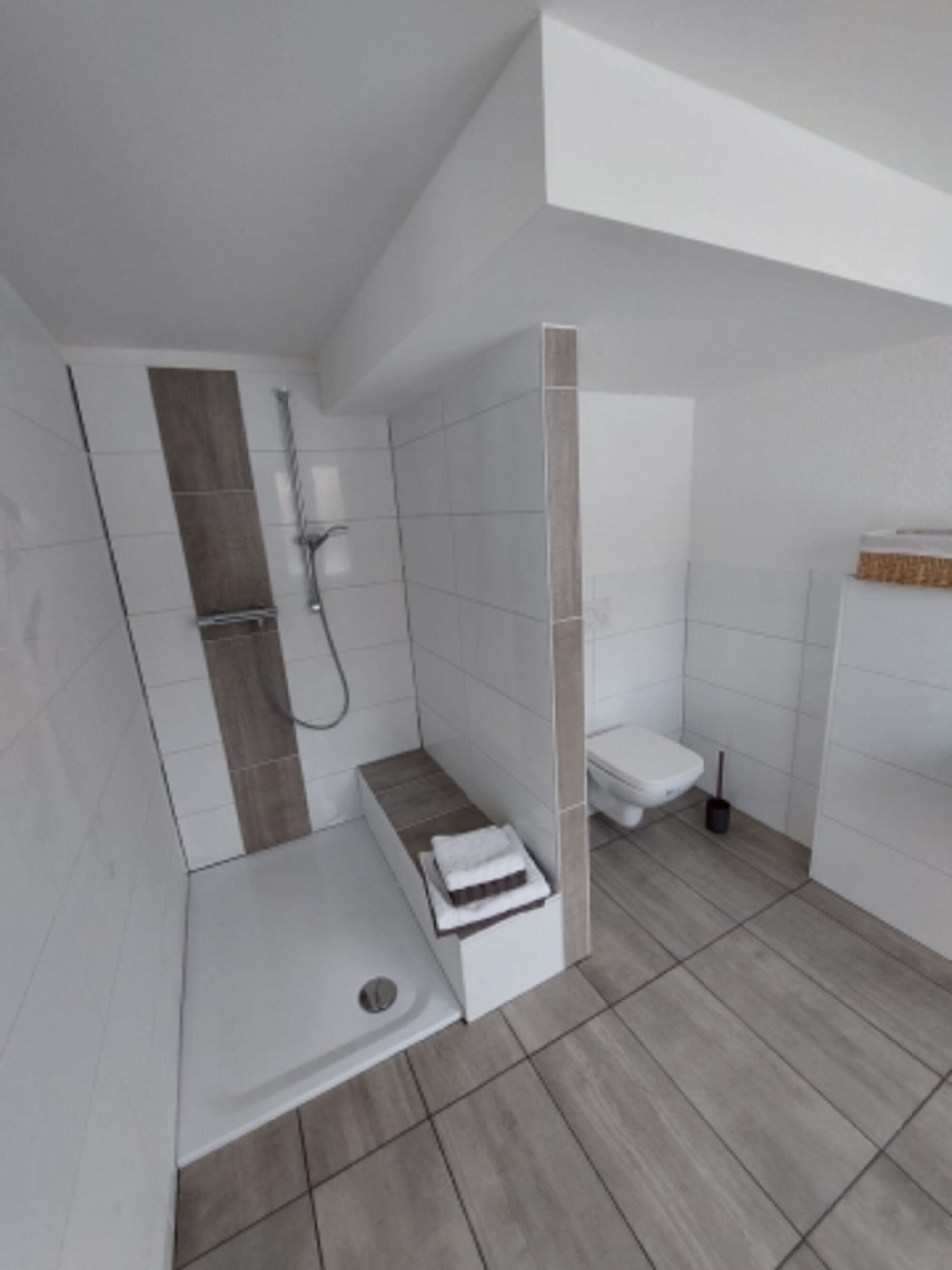 Im Badezimmer finden Sie eine Dusche, WC, Waschbecken, Spiegel mit Beleuchtung, Haartrockner, Handtücher und Fussmatte.