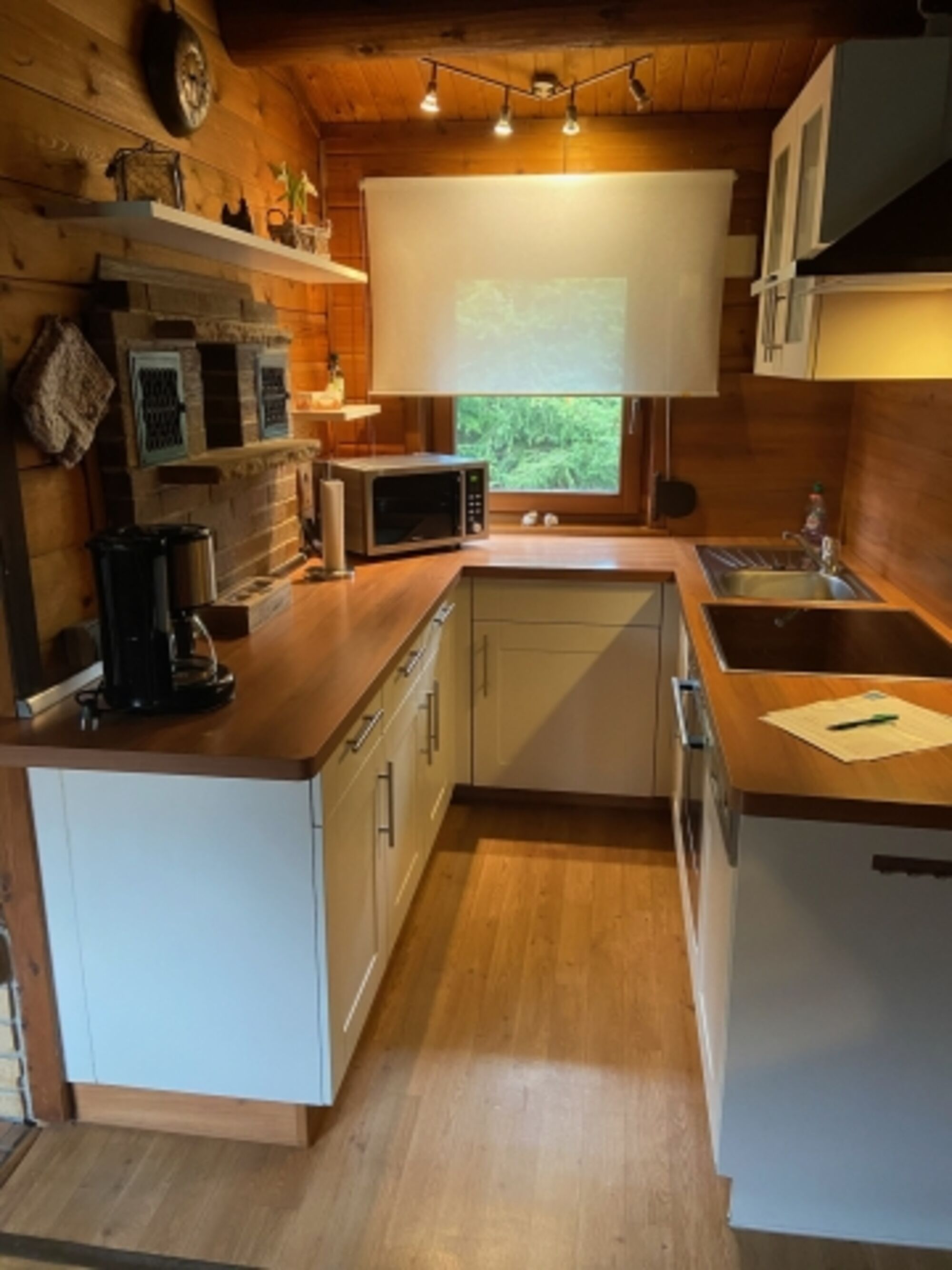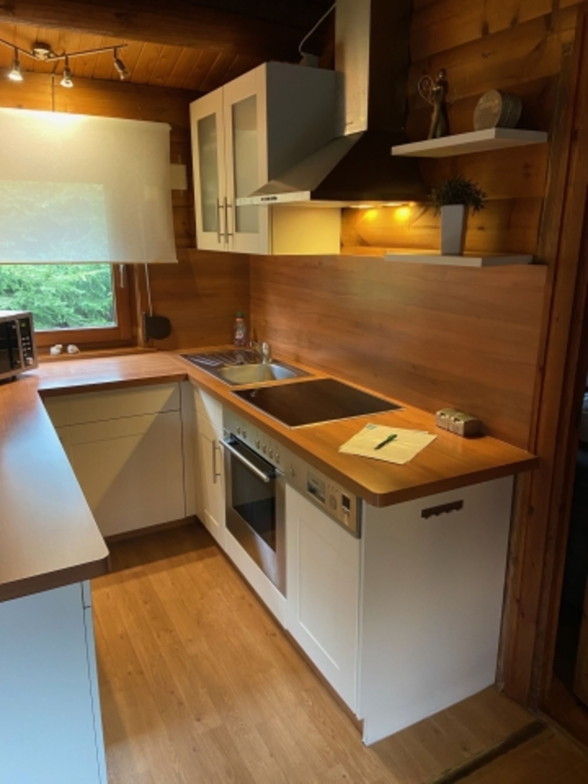Die kleine Küche enthält alles, was man so zum Kochen braucht: ausreichend Geschirr, auch Kindergeschirr, Besteck, Töpfe usw. Sie ist ausgestattet mit einem Herd mit Ceranfeld und Umluftbackofen, Edelstahlmikrowelle, Kühlschrank mit Eisfach und einer Spülmaschine, Kaffeemaschine, einen Toaster, Eierkocher, Wasserkocher uvm.