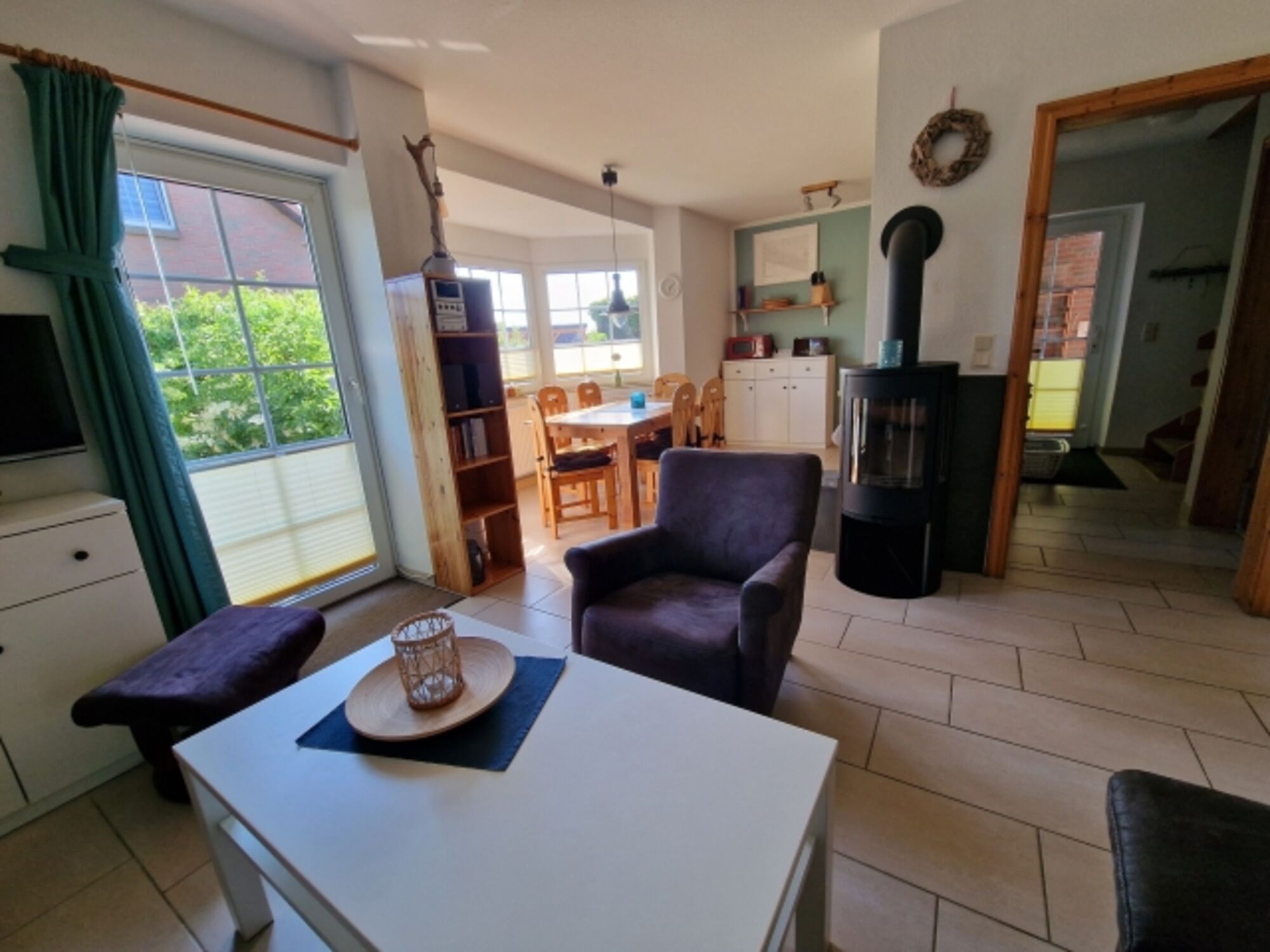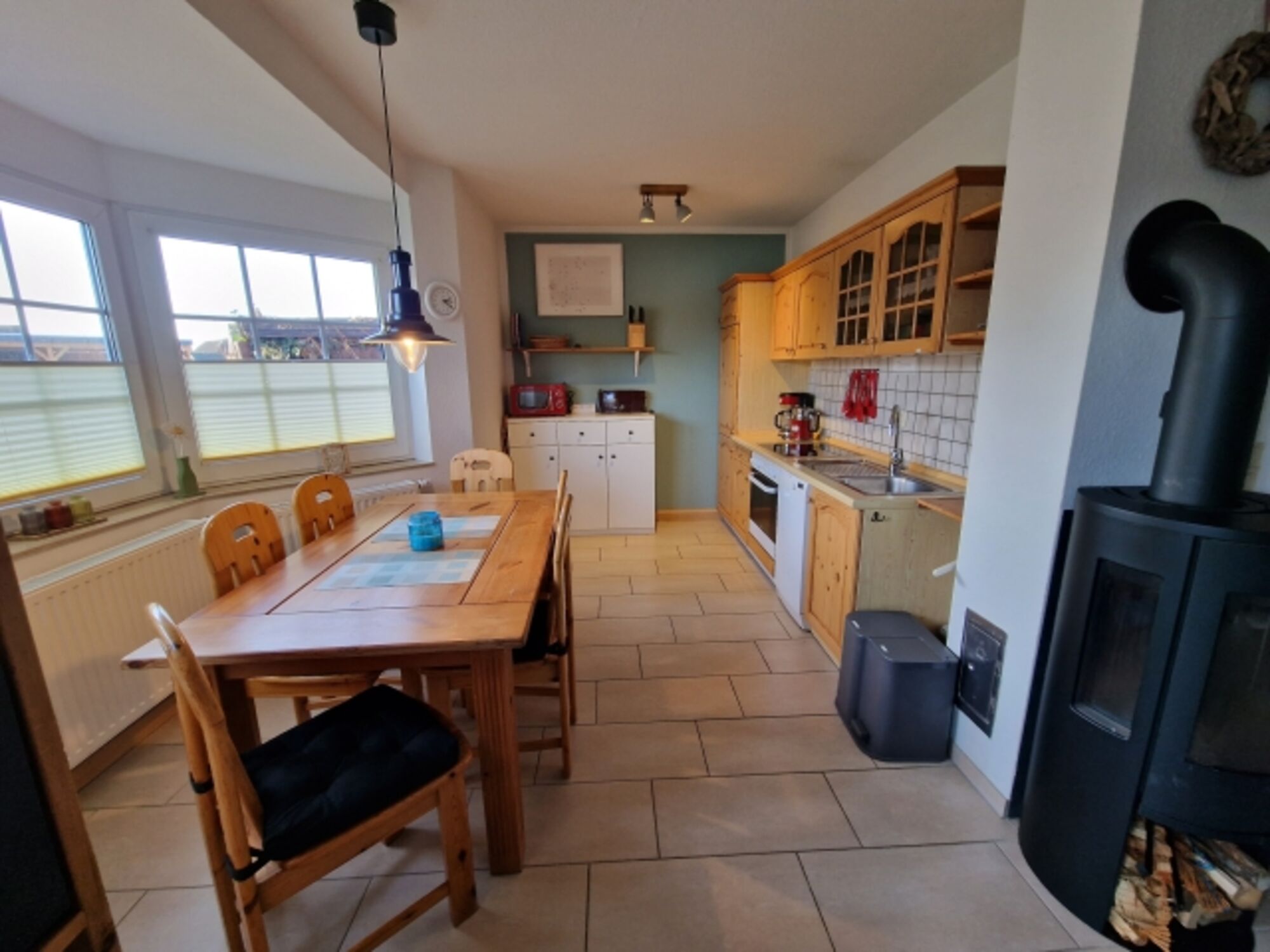 Im Erdgeschoss sorgt die große Wohnküche in Südlage mit Terrassen- und Gartenzugang und neuem skandinavischem Kaminofen bei jedem Wetter für volle Entspannung.