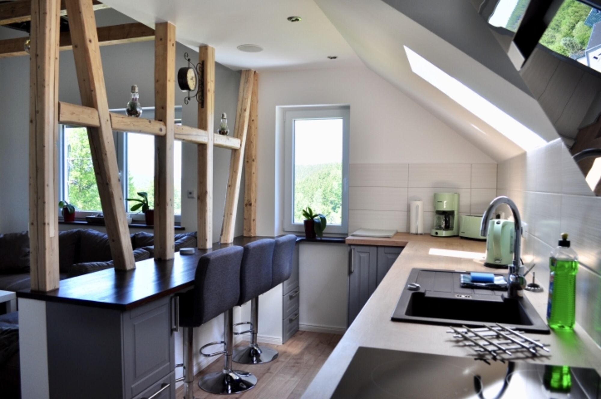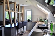 Cerankochfeld, Dunstabzugshaube, Kühlschrank mit Gefrierfach, Tassimo-Kaffeautomat, Korkenzieher / Flaschenöffner, Gewürze (Salz, Pfeffer, Zucker), Geschirrhandtücher, Mülltüten, Essplatz in der Küche
