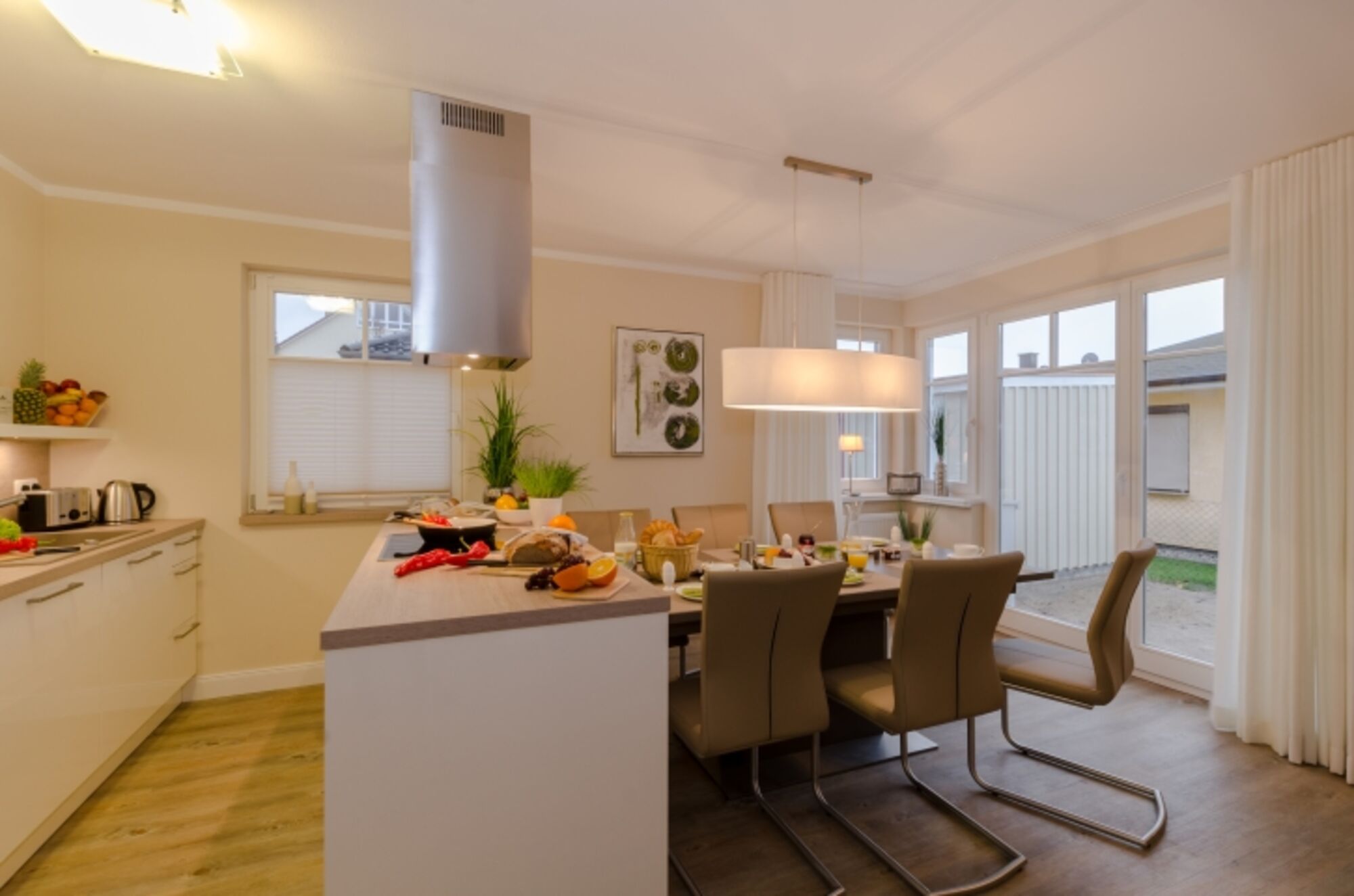 Die moderne und offene Wohnküche wurde mit hochwertigen Geräten und allen Annehmlichkeiten exklusiv ausgestattet. Hier macht die gemeinsame Zubereitung von leckeren Speisen Spaß.