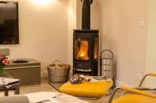 TV, TV-Sat, SMART-TV, TV-Flachbildschirm, HDTV Flachbildschirm, DVD-Player, Blu-Ray-Player, Hi-Fi-Anlage mit Bluetooth, Bücher, Kaminofen, Eckcouch, Sessel, Fliegengitter