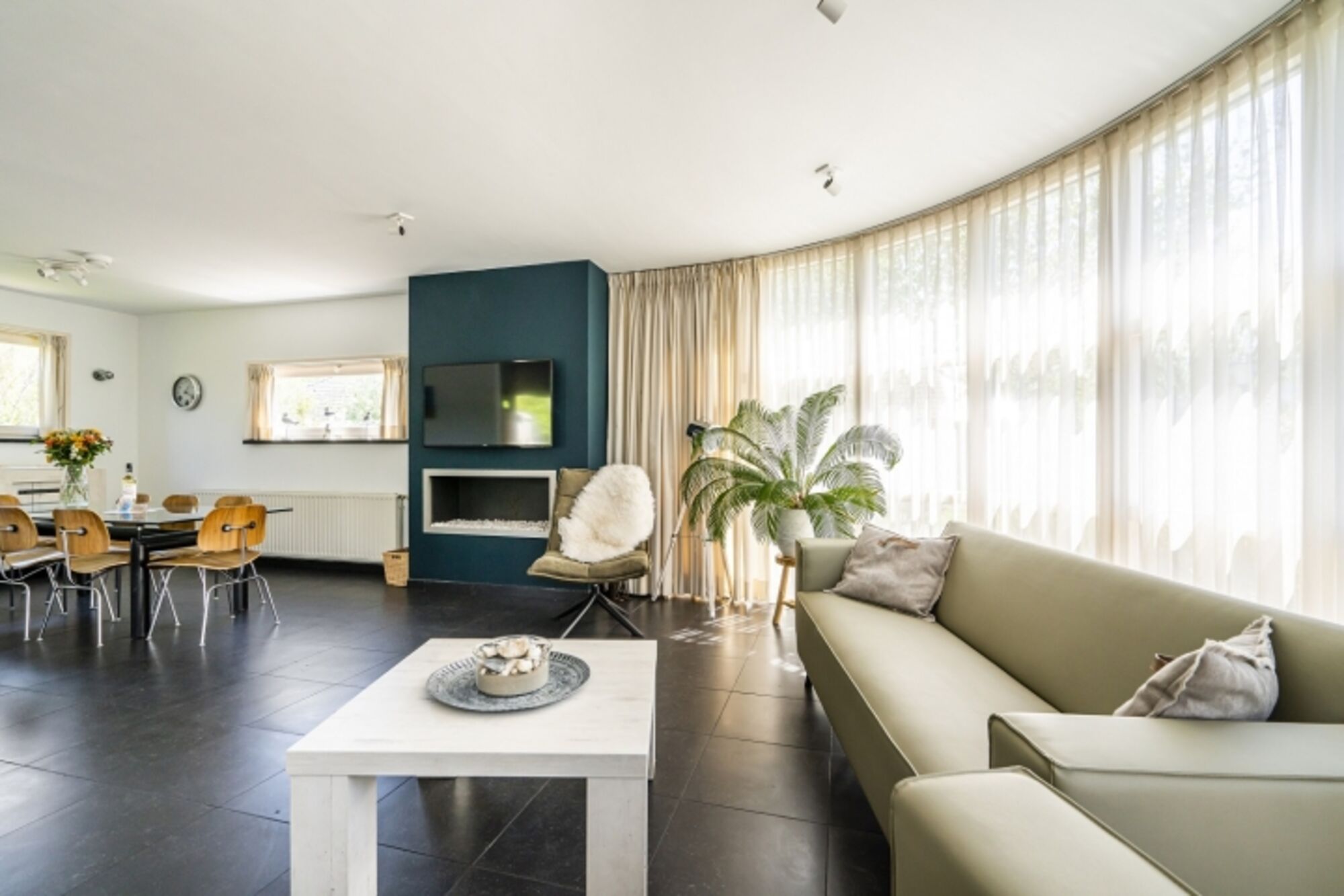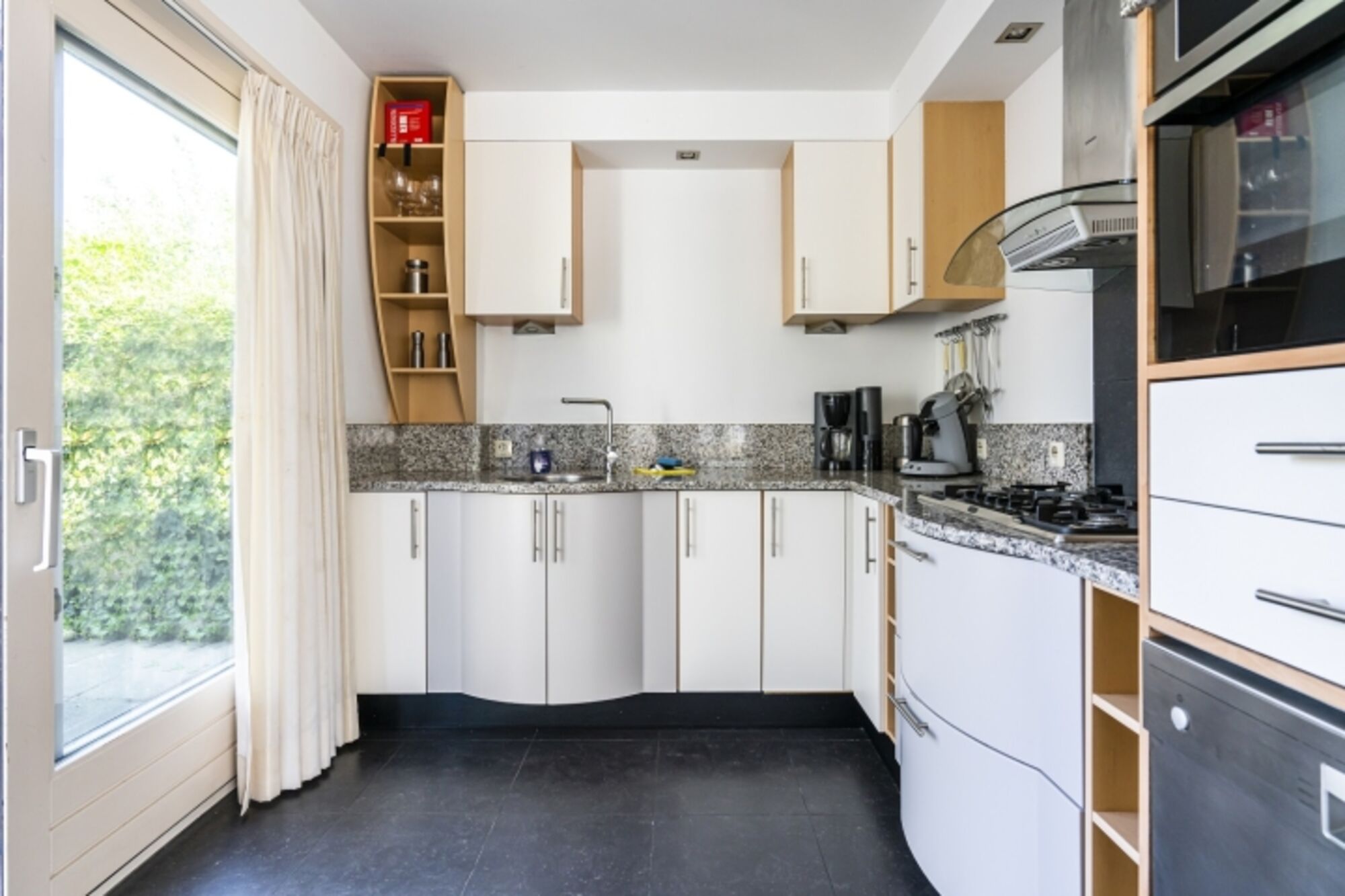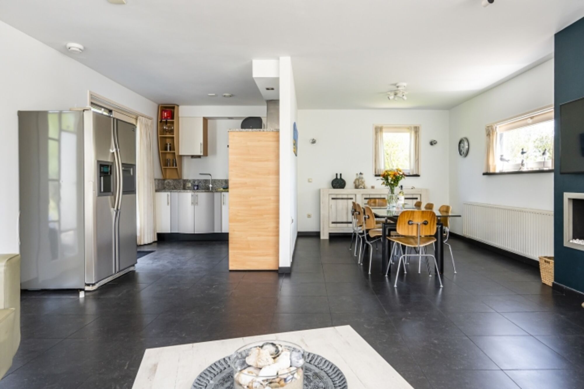 Die Luxus-Ferienvilla Westduin 19 verfügt über ein geräumiges Wohnzimmer, in dem 8 Personen den Gaskamin genießen können. Der eingezäunte Garten ist durch die Schiebetüren über die Küche leicht zugänglich. Die offene Küche ist komplett ausgestattet mit Geschirrspüler, amerikanischem Kühlschrank mit Gefrierfach, Gasherd und Kombimikrowelle. Ein Wasserkocher, eine Senseo und eine Filterkaffeemaschine sind ebenfalls vorhanden.