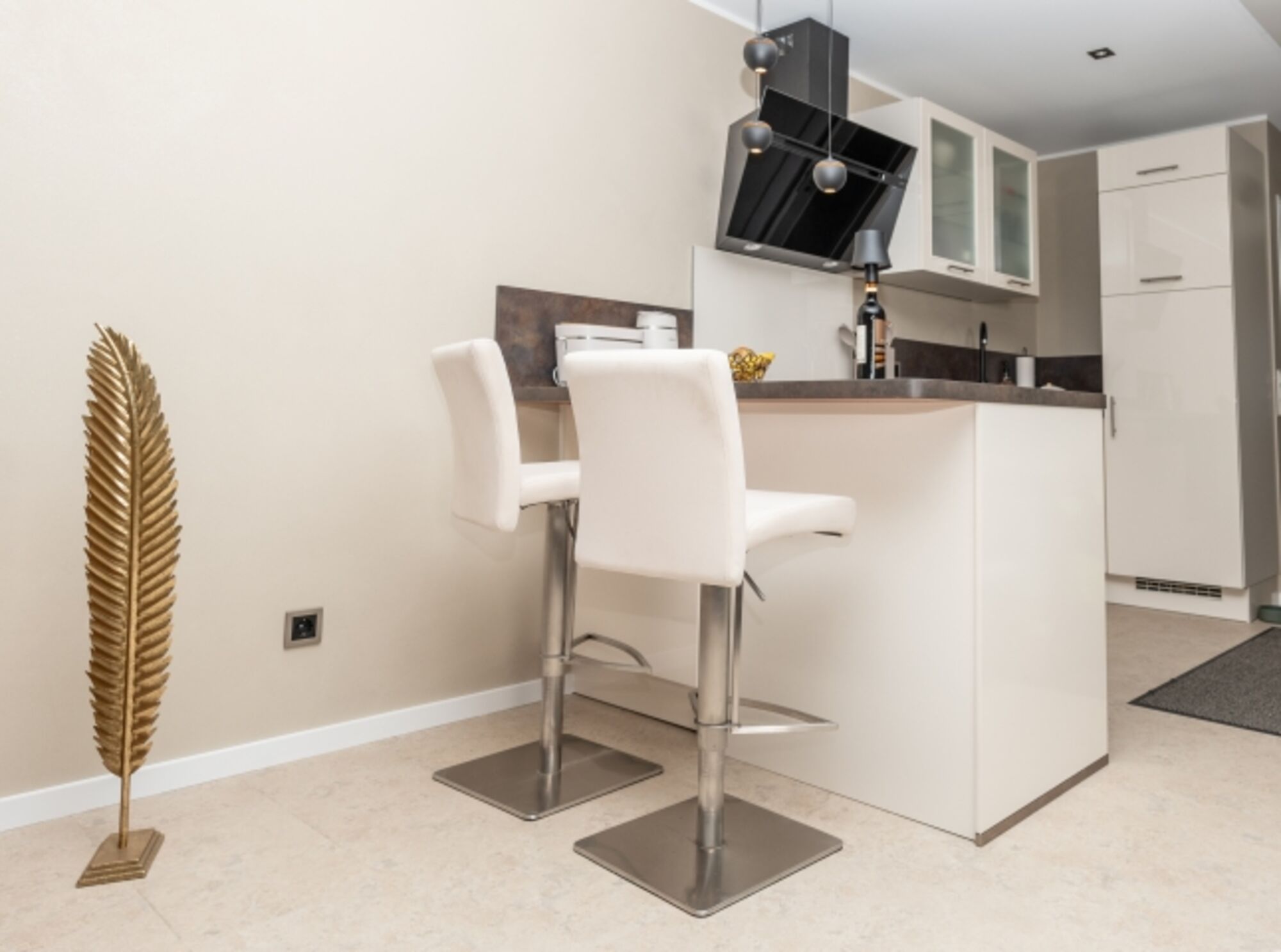 Im großzügigen Wohnzimmer sorgt eine hochwertige Eckcouch für gemütliche Abende mit bestem Blick auf den TV. Die moderne Küche ist vollständig ausgestattet – inklusive Backofen und Mikrowelle – und lässt keine Wünsche offen.