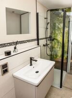 Waschbecken, Regendusche, Spiegel, Fenster im Bad
