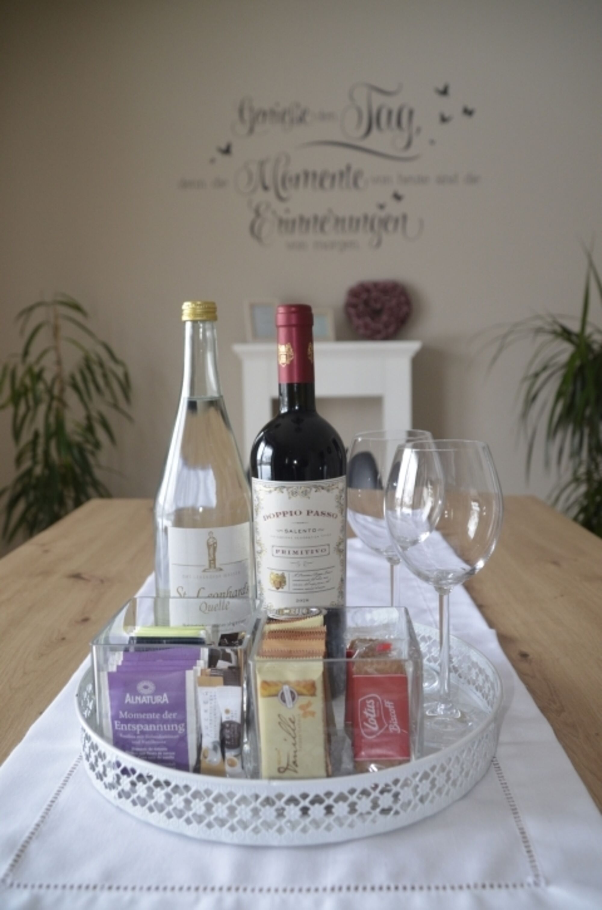 Ein Willkommensgeschenk mit einer Flasche Wein, einer Flasche Wasser, einer kleinen Teeauswahl und Gebäck erwartet Sie bei Ihrer Ankunft.