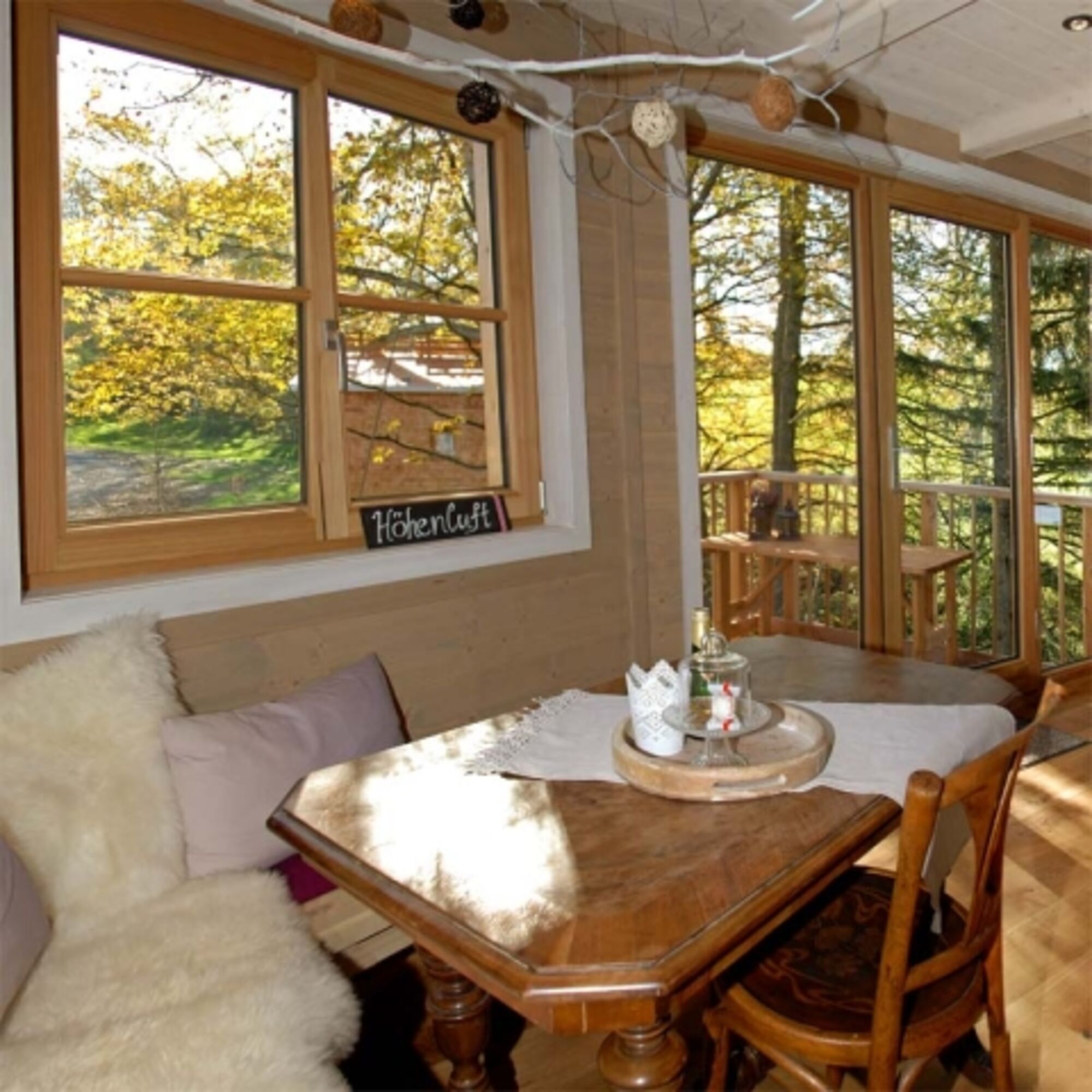 Unser liebevoll gestaltetes Baumhaus ist mehr als nur eine Unterkunft – es ist ein Rückzugsort, der Sie hoch über dem Boden in die Arme der Natur entführt. Die gemütliche Einrichtung sorgt dafür, dass Sie sich vom ersten Moment an wie zu Hause fühlen. Die großen Panoramafenster bieten atemberaubende Ausblicke auf das umliegende Grün, während Sie inmitten der Baumwipfel entspannen.