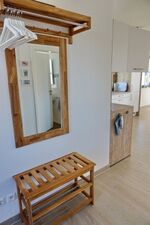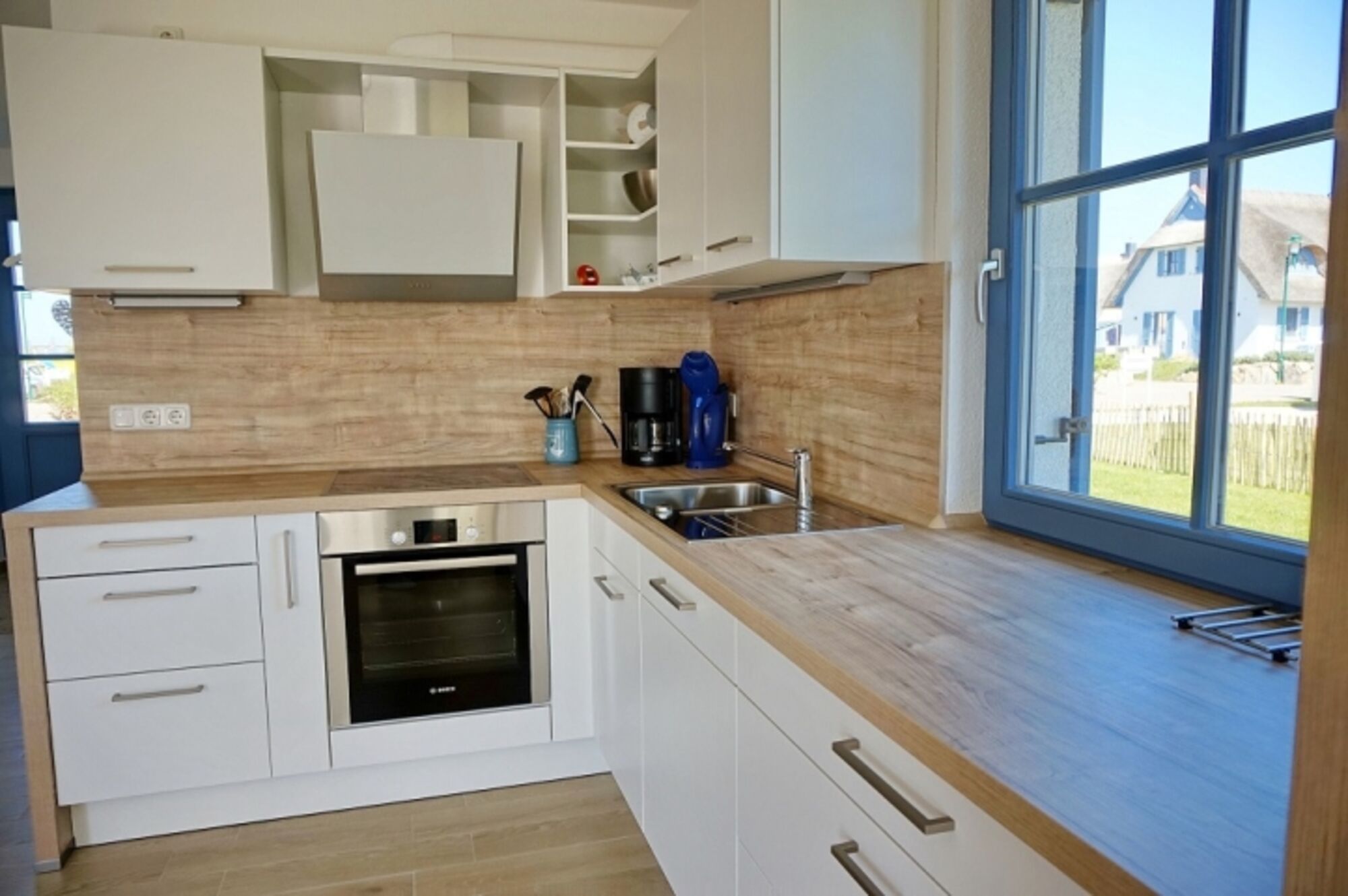 Induktionsherd, Dunstabzugshaube, Kühlschrank mit Gefrierfach, Eierkocher, Mixer, Korkenzieher / Flaschenöffner, Gewürze (Salz, Pfeffer, Zucker), Öl / Essig, Geschirrhandtücher, Mülltüten, Essplatz in der Küche