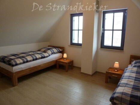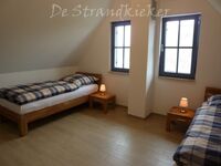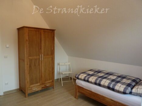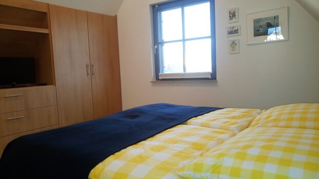 Im Obergeschoss finden Sie zwei großzügige Schlafzimmer (je 15 qm) und ein Bad vor. Das Schlafzimmer mit Seeblick ist mit einem Doppelbett (180x200), einem eingebauten Schlafzimmer, einer Kommode, zwei Nachttischen und einem zweiten TV ausgestattet. Ein Kinderreisebett findet hier ebenfalls Platz und kann auf Anfrage zur Verfügung gestellt werden. Im Kinderzimmer befinden sich zwei Einzelbetten (90x200), ein Schrank, eine Kommode und zwei Nachttische. Fliegenschutzgitter zum Lüften sind angebracht. Zum Verdunkeln dienen die Klappläden des Reethauses. Ihr Urlaub beginnt sofort - die Bettwäsche ist inklusive und am Anreisetag bereits frisch bezogen. Das moderne Vollbad unter der charakteristischen Fledermausgaube sorgt für ein behagliches Wohngefühl. Es ist mit hochwertigen Sanitärelementen (eine Badewanne und einer Dusche) ausgestattet. Ein Fön ist ebenfalls vorhanden. Die überdachte Südterrasse ist mit Gartenmöbeln möbliert und der große Garten mit Außengrill lädt zum Entspannen und Spielen ein. Das Gartenhäuschen zum Unterstellen von mitgebrachten Fahrrädern steht im eingefriedetem Garten. Ein Fahrradständer und Parkplatz befinden sich direkt auf dem Grundstück. Der Naturstrand ist in ca. 500 m zu erreichen.