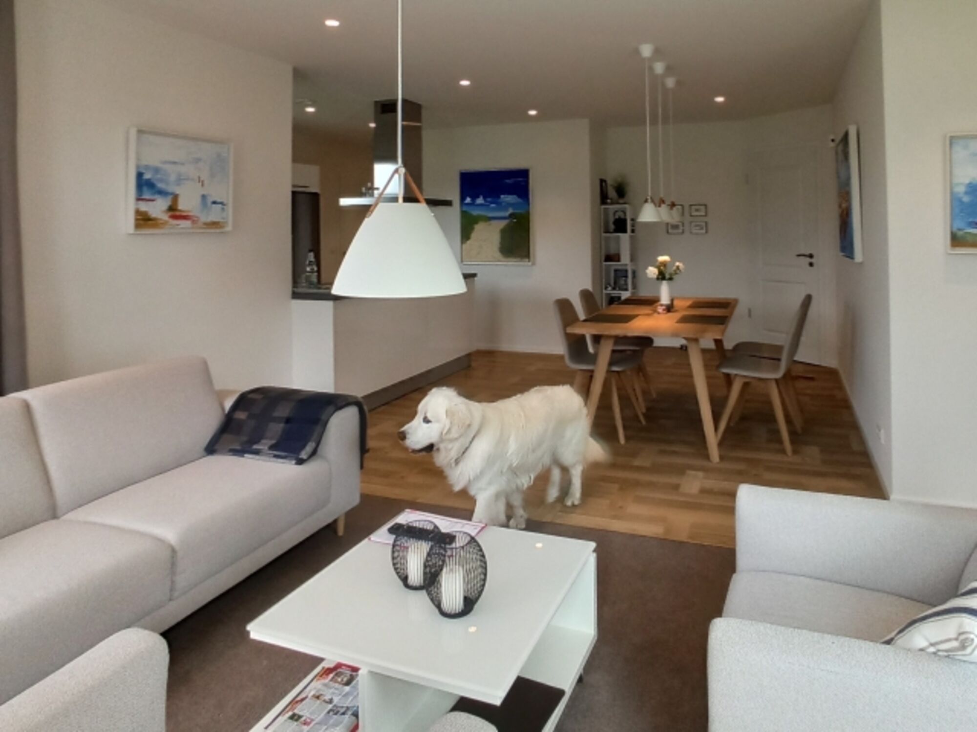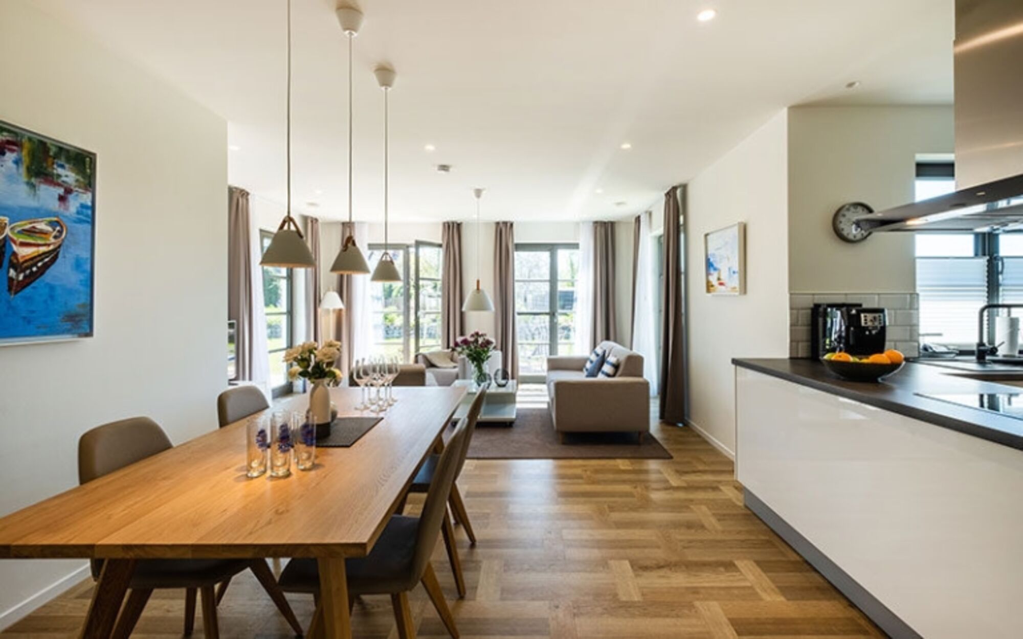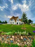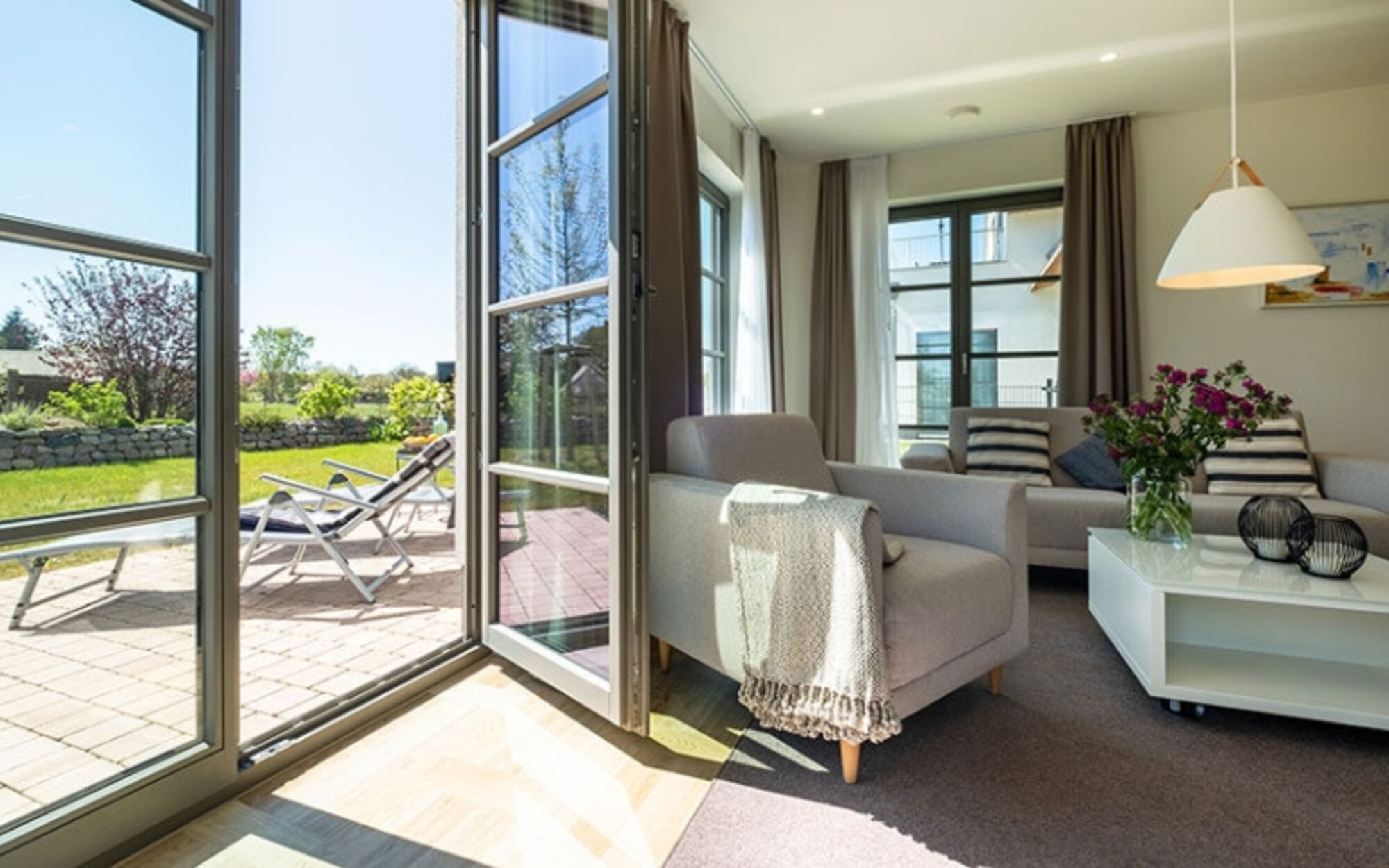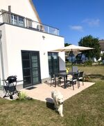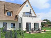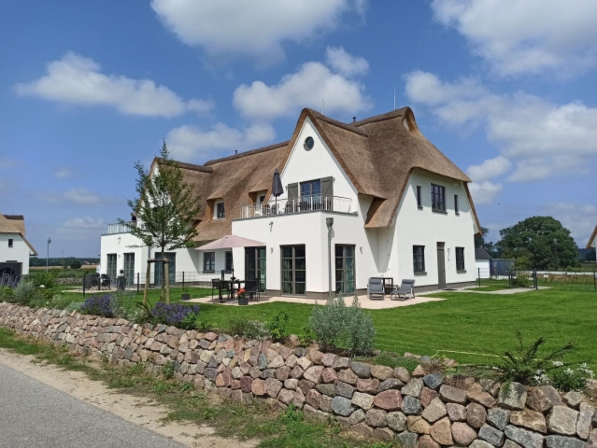 Die Ferienwohnung verfügt über einen Garten mit zwei Terrassen, mit Blick auf die nahe gelegene Haff Küste . Die Wohnung besteht aus einem Wohn-, Ess- und Küchenbereich mit einer hellen und modernen Ausstattung. Freundliche Farben prägen diese Wohnung. Zur Ferienwohnung gehören zwei Außenstellplätze, sowie ein Außenabstellraum, welcher über einen Stromanschluss für das Laden von E-Bikes ausgestattet ist. Zwei E-Auto Ladestationen sind neben dem Bürogebäude vorhanden. Die rund 2.000 m² Außenanlage, allein um dieses Ferienhaus mit vier Wohneinheiten, ist gartenarchitektonisch gestaltet und zum Teil von einer bepflanzten Findlingsmauer umgeben. Stilvolle Ferien unter Reet ist hier gegeben.