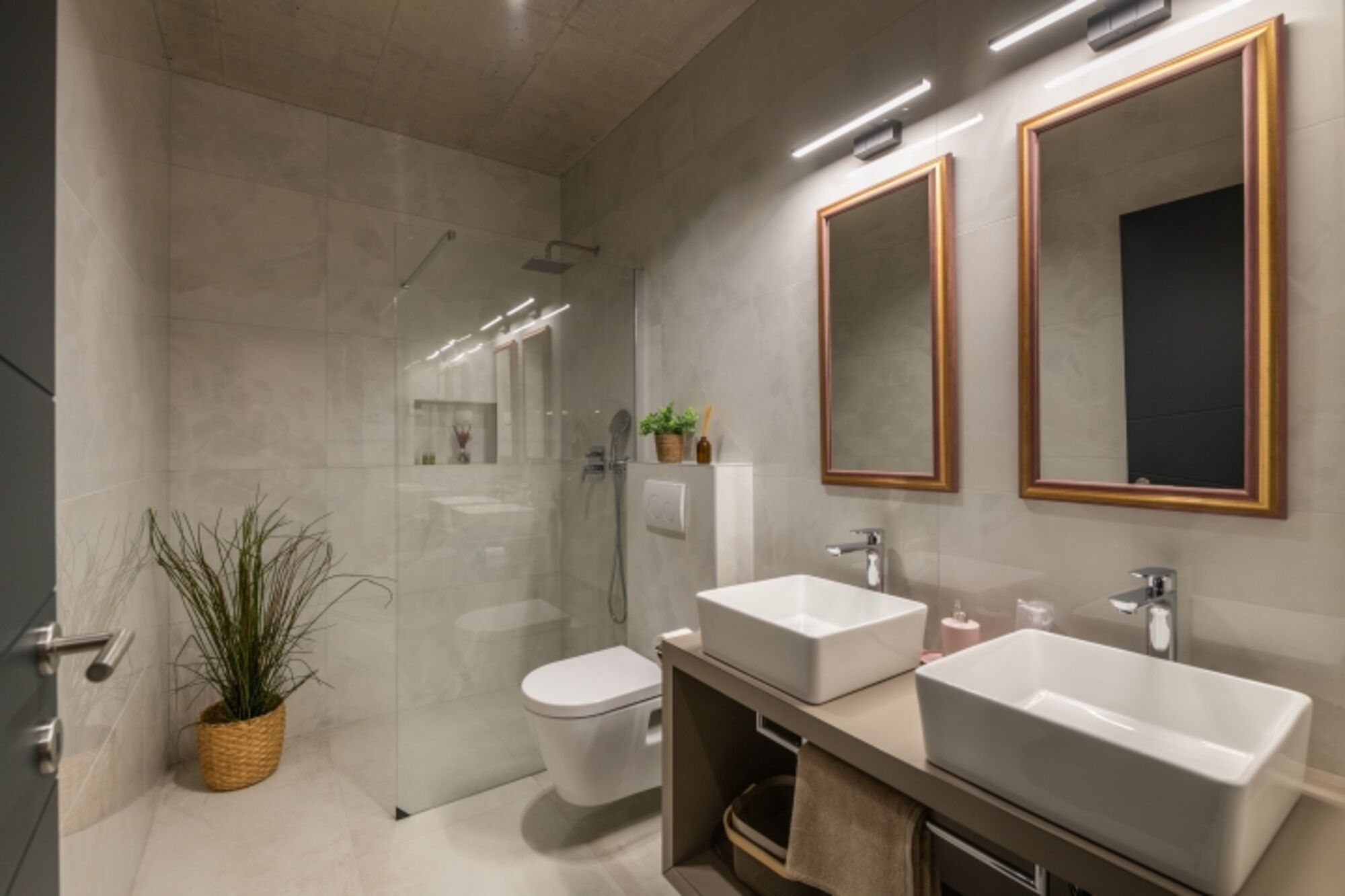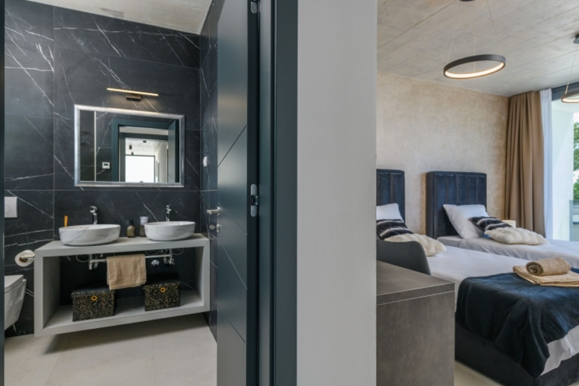 Doppelwaschbecken, Spiegel, Fenster im Bad