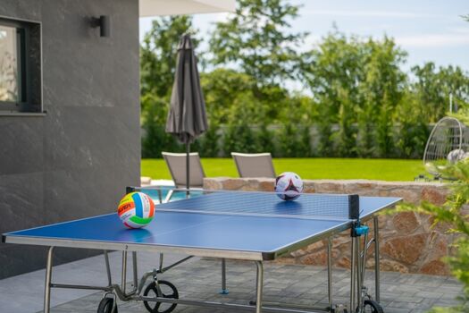 Der Whirlpool und Sauna im Innenbereich sorgt für Entspannung, während der Pool von luxuriösen Liegestühlen umgeben ist, die zum Erfrischen und Sonnenbaden einladen. Sportbegeisterte vergnügen sich beim Tischtennis, Tischfußball und Darts. Der große Garten bietet Privatsphäre und Platz zum Entspannen oder für Outdoor-Aktivitäten.
