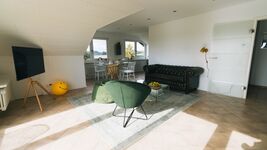 Wohnzimmer: Großzügiges Wohnzimmer mit Couch und Sitzsäcken, einem Lesesessel, Kicker, Smart TV und einem freien Blick auf Koppeln rund um das Haus.