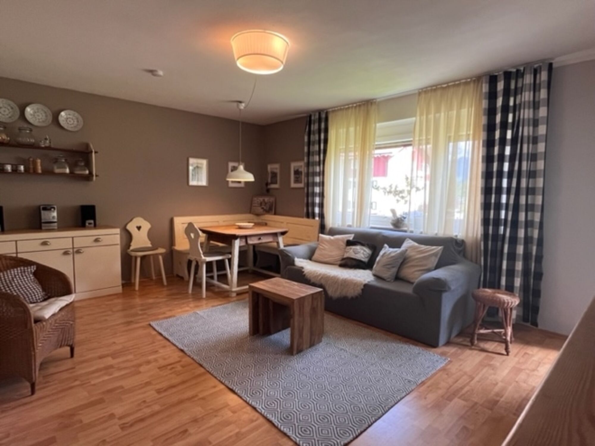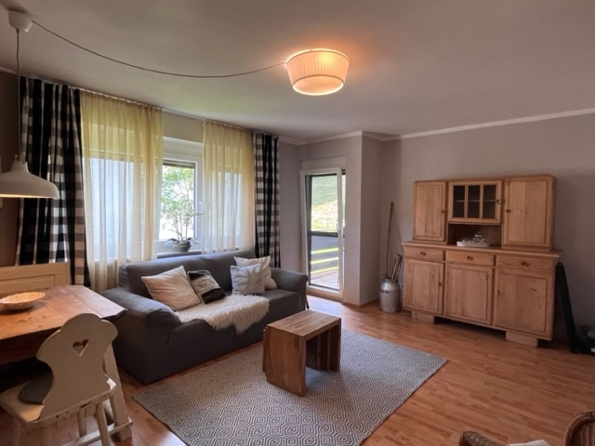 Die Wohnung hat ein gemütliches Schlafzimmer mit Naturkautschukmatrazen und einem Topper. Im Wohnraum befindet sich zusätzlich eine Schlafcouch, die 160cm Breite misst und so für 2 Personen geeignet ist. Mit einer aus einem Bauernhaus stammenden alten Eckbank mit zugehörigem Tisch fühlen Sie sich gleich auf dem Land, wie auch der Blick vom Balkon auf die am Grundstück angrenzende Kuhweide. Hier wird sich bestimmt Ihr Hund auch wohlfühlen. Die Balkontür ist praktisch mit einem Fliegengitter versehen. Gemütliche Balkonmöbel machen hier ein Frühstück mit dem Blick auf Kühe perfekt. Eine Markise schützt im Sommer vor zu starker Sonneneinstrahlung.