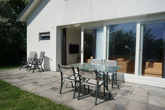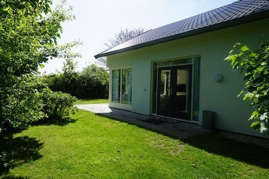 Zum Bungalow gehört ein großer, sonniger Garten, der rund ums Haus geht, und eine schöne Terrasse auf der Südseite hat. Der Garten ist komplett eingezäunt. Das Auto kann vor dem Bungalow geparkt werden.