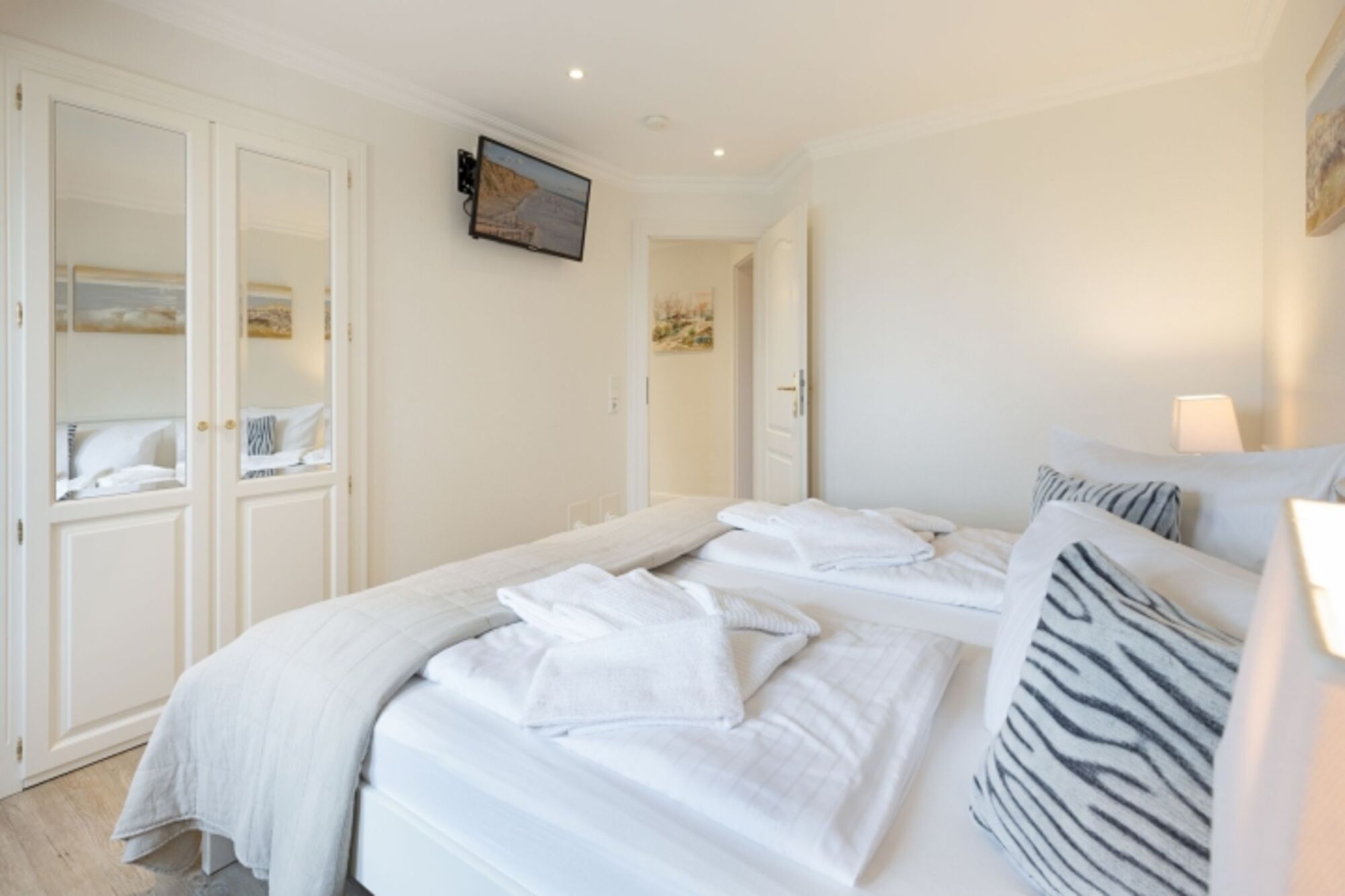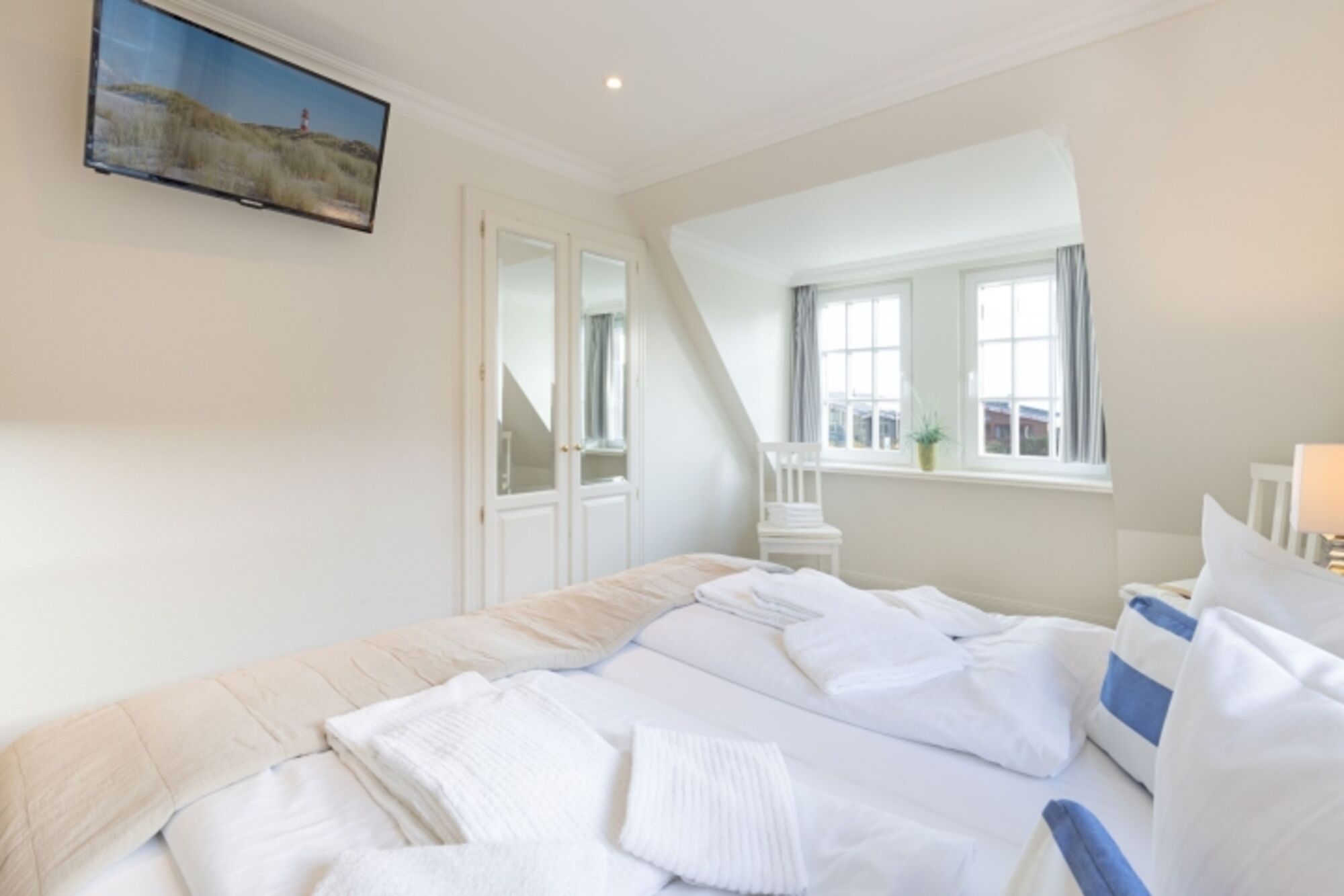 Im Dachgeschoss des Hauses finden Sie das dritte Schlafzimmer mit zwei Einzelbetten und einem Fernseher sowie einen gemütlichen Aufenthaltsraum.