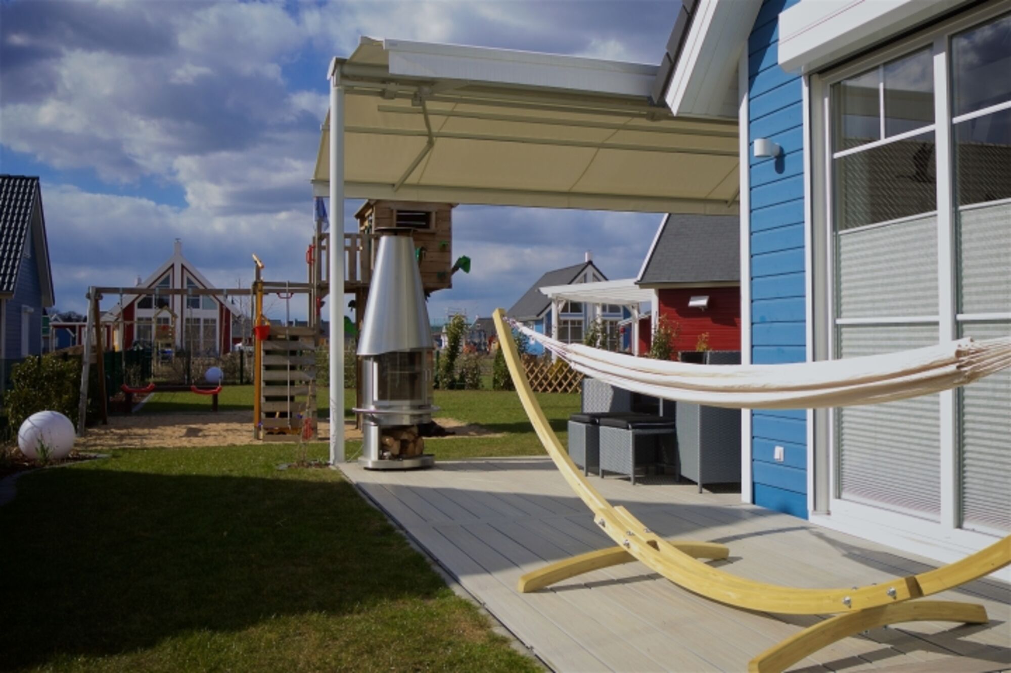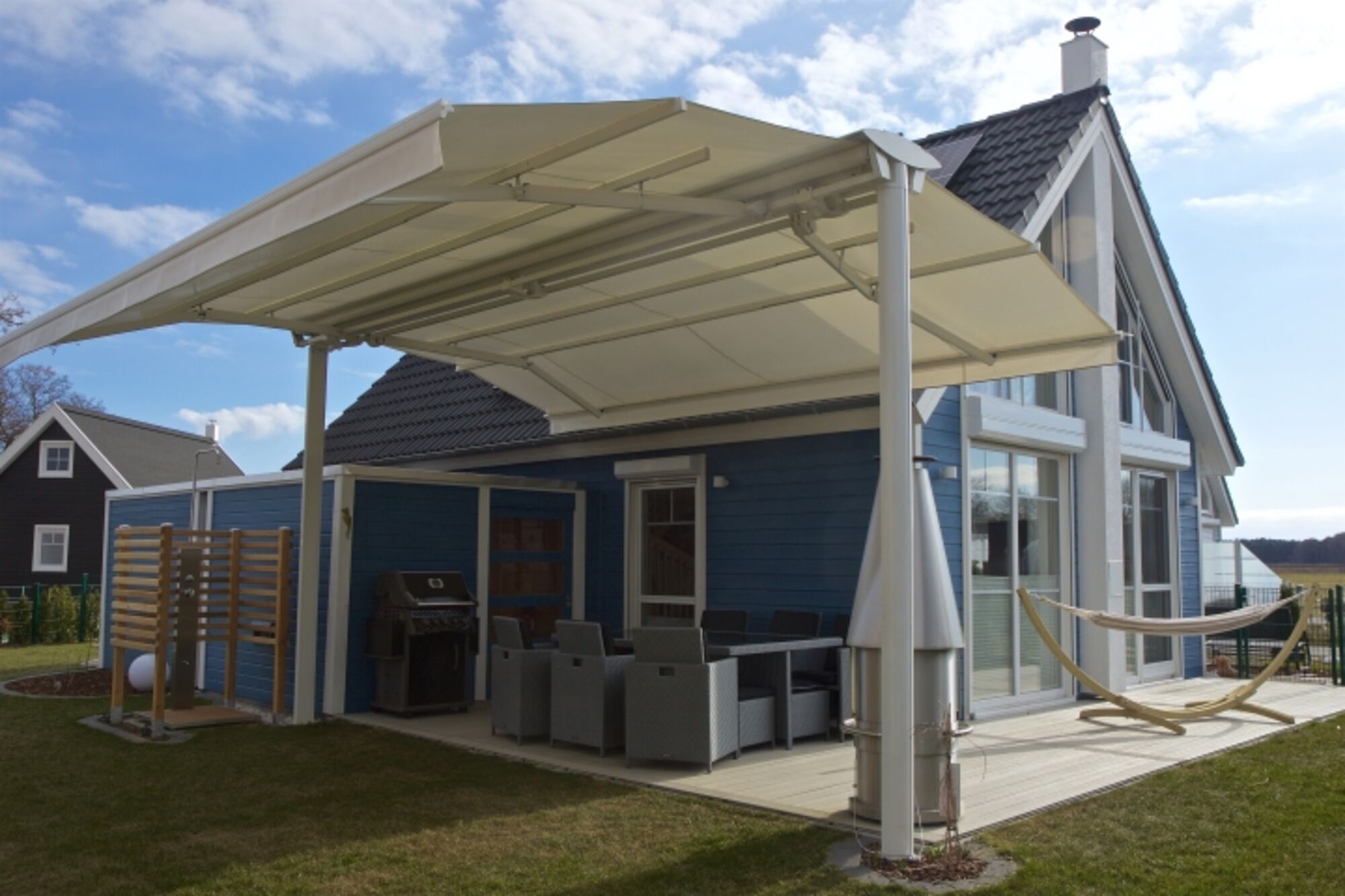 Liegewiese, Gartenmöbel, Gasgrill, Bänke, Holzgrill, Außenkamin, Markise, Überdachte Terrasse (mobil), Windschutz, Sauna im Garten