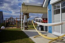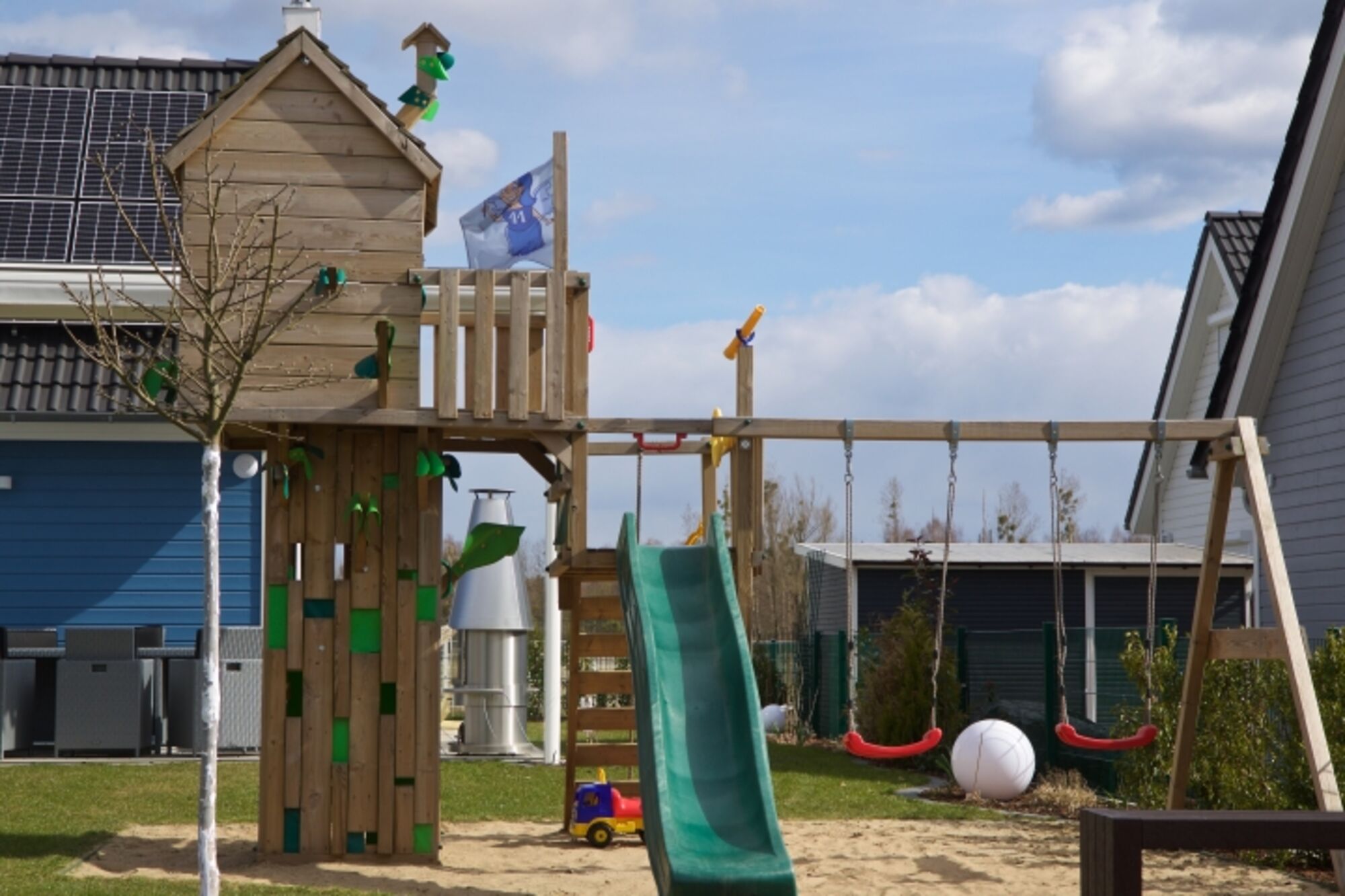 - großer Spielplatz mit Baumhaus, Schaukeln, Rutsche und 25 qm Sandkasten