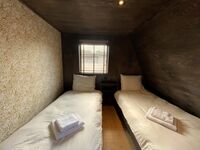 Im Obergeschoss befinden sich die beiden anderen Schlafzimmer mit einem gemeinsamen Bad. Ein Schlafzimmer ist mit einem komfortablen Boxspring-Doppelbett ausgestattet, das zweite Schlafzimmer mit zwei Boxspring-Einzelbetten. Das luxuriöse Badezimmer bietet eine verlockende Regendusche, Waschbecken und Toilette.