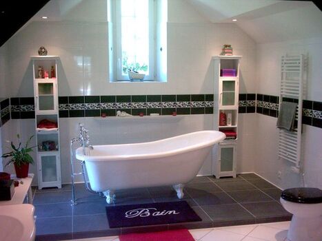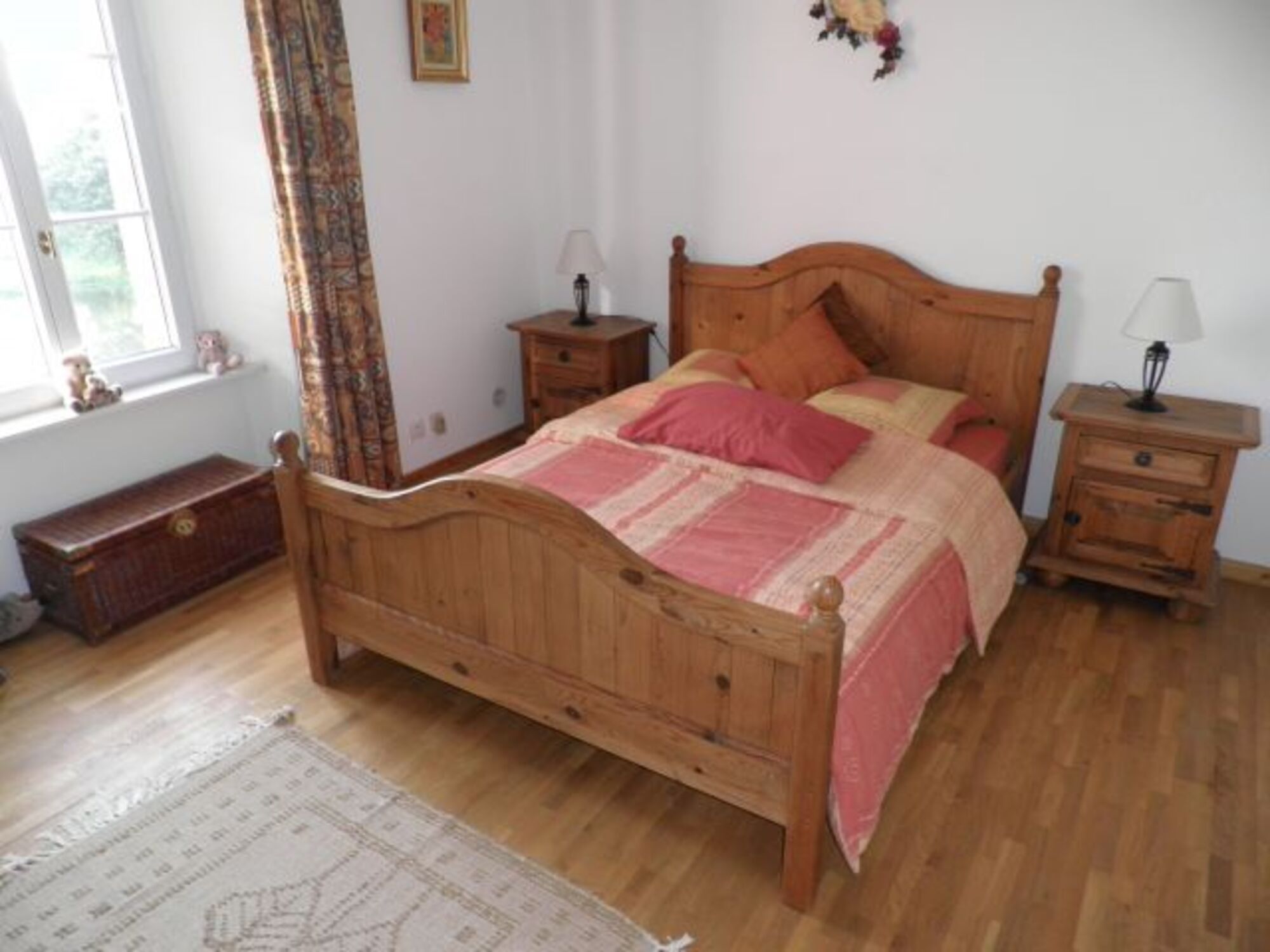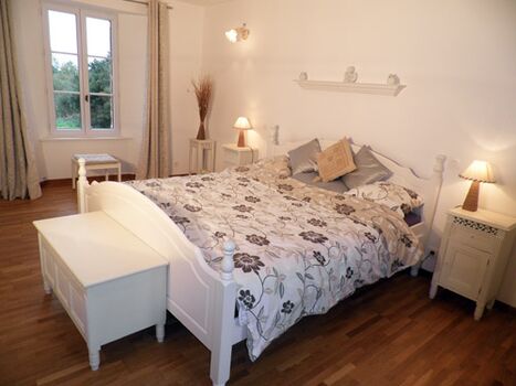 Im ersten Stock finden Sie zwei helle, freundliche Schlafzimmer mit Doppelbett (1.80m x 2m und 1.40m x 1.90m) und wunderschönem Ausblick über die umliegenden Wiesen und Hecken. Neben den beiden Doppelzimmern ist das luxuriöse Badezimmer mit 1.20m grosser Regendusche, freistehender Badewanne, Waschbecken, Bidet und WC.