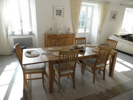 Im Erdgeschoß finden Sie ein 55m² großes, liebevoll eingerichtetes Wohn- Esszimmer . Im Wohnzimmerbereich befindet sich eine gemütliche Sitzgruppe, eine Musikanlage, ein 104cm grosser Flachbildfernseher (Digital HD Sat. Deutsch), VCR und DVD spieler. Im Essbereich sorgen die hellen Eichenmöbel und der rustikale Kaminofen für eine behagliche Atmosphäre. Kabelloser DSL Internetzugang befindet sich im ganzen Haus. Eine helle, moderne Einbauküche im Landhausstil, komplett eingerichtet mit 5 Plattenherd mit Grill und 2 Backöfen, Kühlschrank, Geschirrspülmaschine, Gefriertruhe, Mikrowelle, Kaffeemaschine, Toaster,Wasserkocher usw sowie eine Gästetoilette und eine Waschküche mit Waschmaschine, Bügelbrett und Wäschespinne.