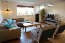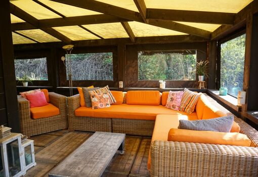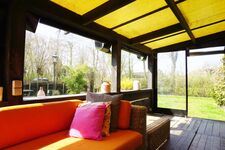 Die Veranda wurde mit Planen ausgestattet, damit Sie auch bei nicht so schönem Wetter geschützt draußen sein und genießen können. Auf der Veranda stehen eine komfortable Sitzecke und ein runder Esstisch mit vier Stühlen. Über die Veranda gelangen Sie in den großen, umzäunten, sonnigen Garten. Im Garten steht ein Schuppen, in dem Sie Ihre Fahrräder unterbringen können.