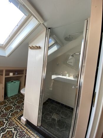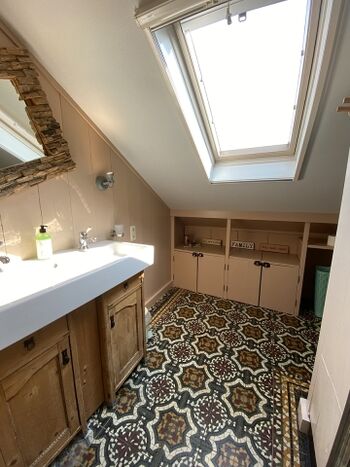 Über die Treppe im Flur gelangen Sie in die obere Etage des Hauses. Hier befinden sich zwei große Schlafzimmer, die beide mit einem Doppelbett mit Einzelmatratzen und Einzelbettdecken ausgestattet wurden. Beide Schlafzimmer haben einen Einbauschrank. In der oberen Etage gibt es ein kleines, aber sehr schönes Badezimmer. Dieses wurde mit einer Regen- und Handdusche, einem Waschtisch und einer Toilette ausgestattet.