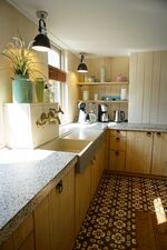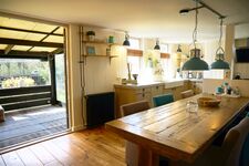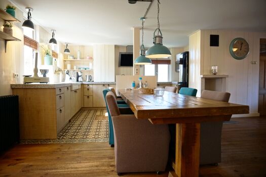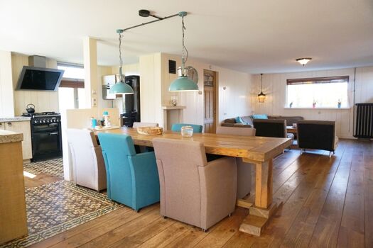 Das Wohnzimmer verfügt über eine ländliche Wohnküche und einen großen Esstisch. Die Küche wurde mit einem 5-flammigen Gasherd, einem Backofen, einem großen Kühlschrank mit großem Tiefkühlfach ausgestattet. Das Wohnzimmer hat zwei französische Türen mit Zugang zur überdachten Veranda.
