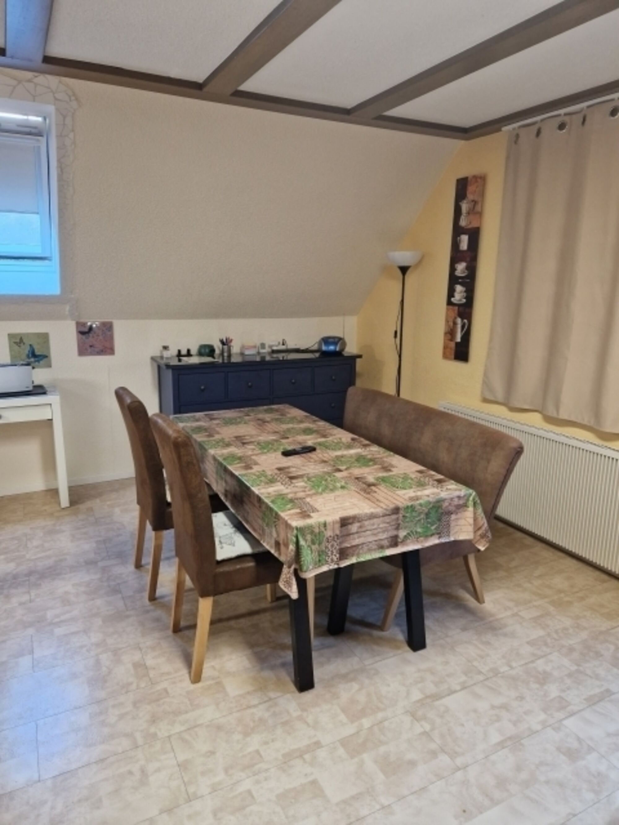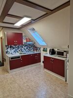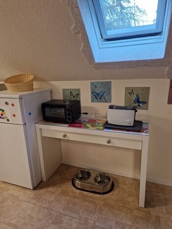 Cerankochfeld, Dunstabzugshaube, Kühlschrank mit Gefrierfach, Eierkocher, Korkenzieher / Flaschenöffner, Geschirrhandtücher, Mülltüten, Essplatz in der Küche