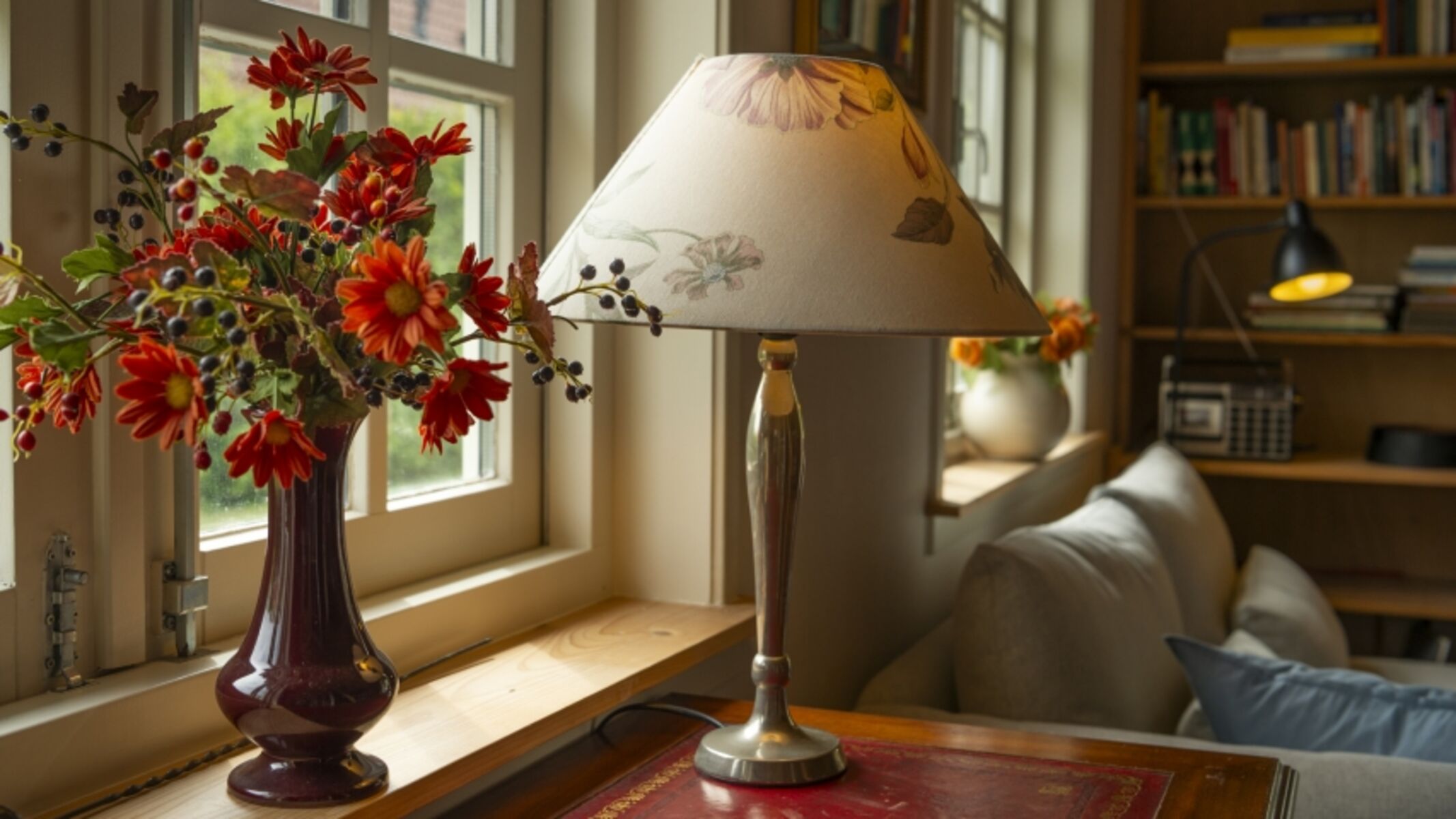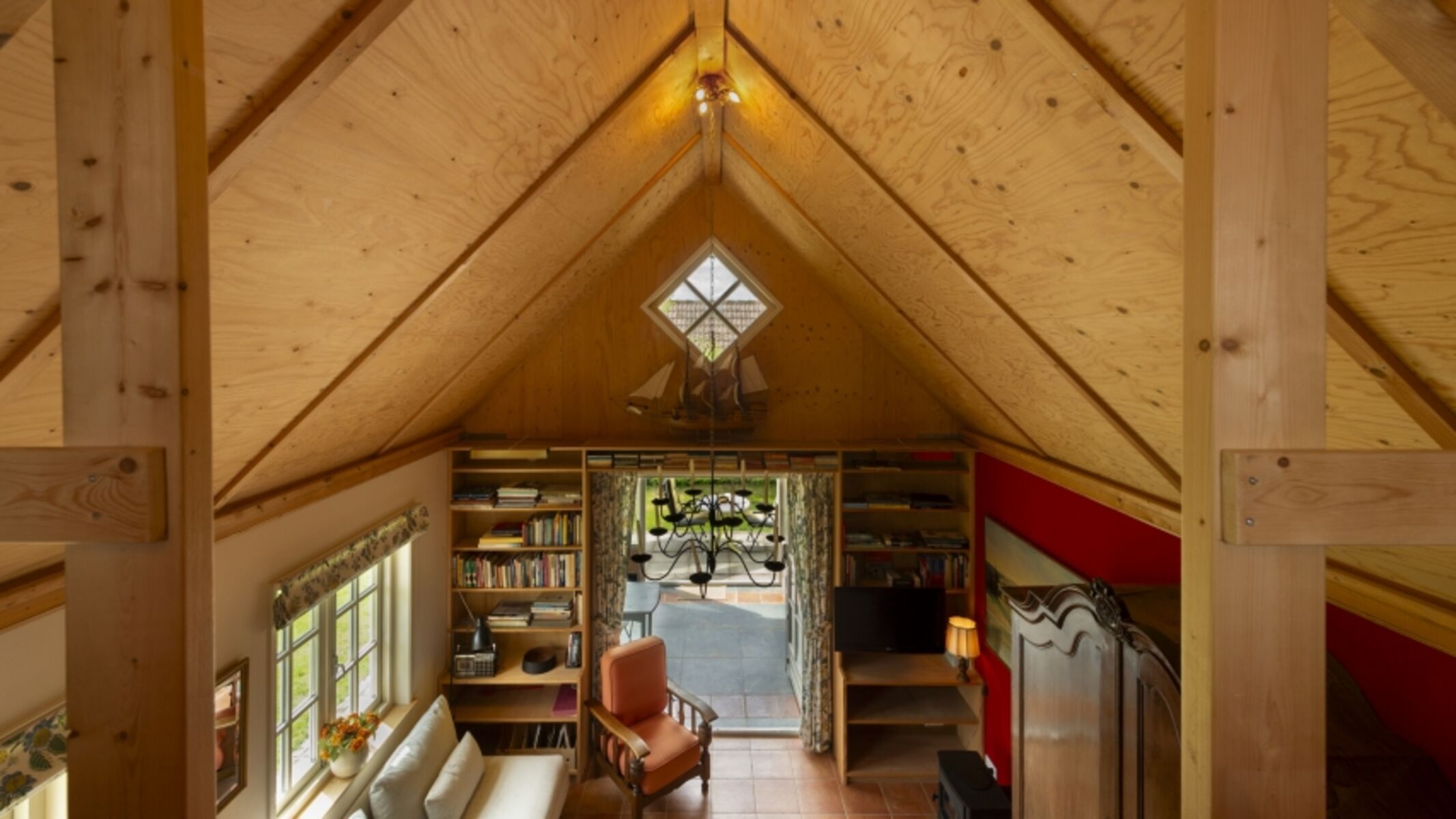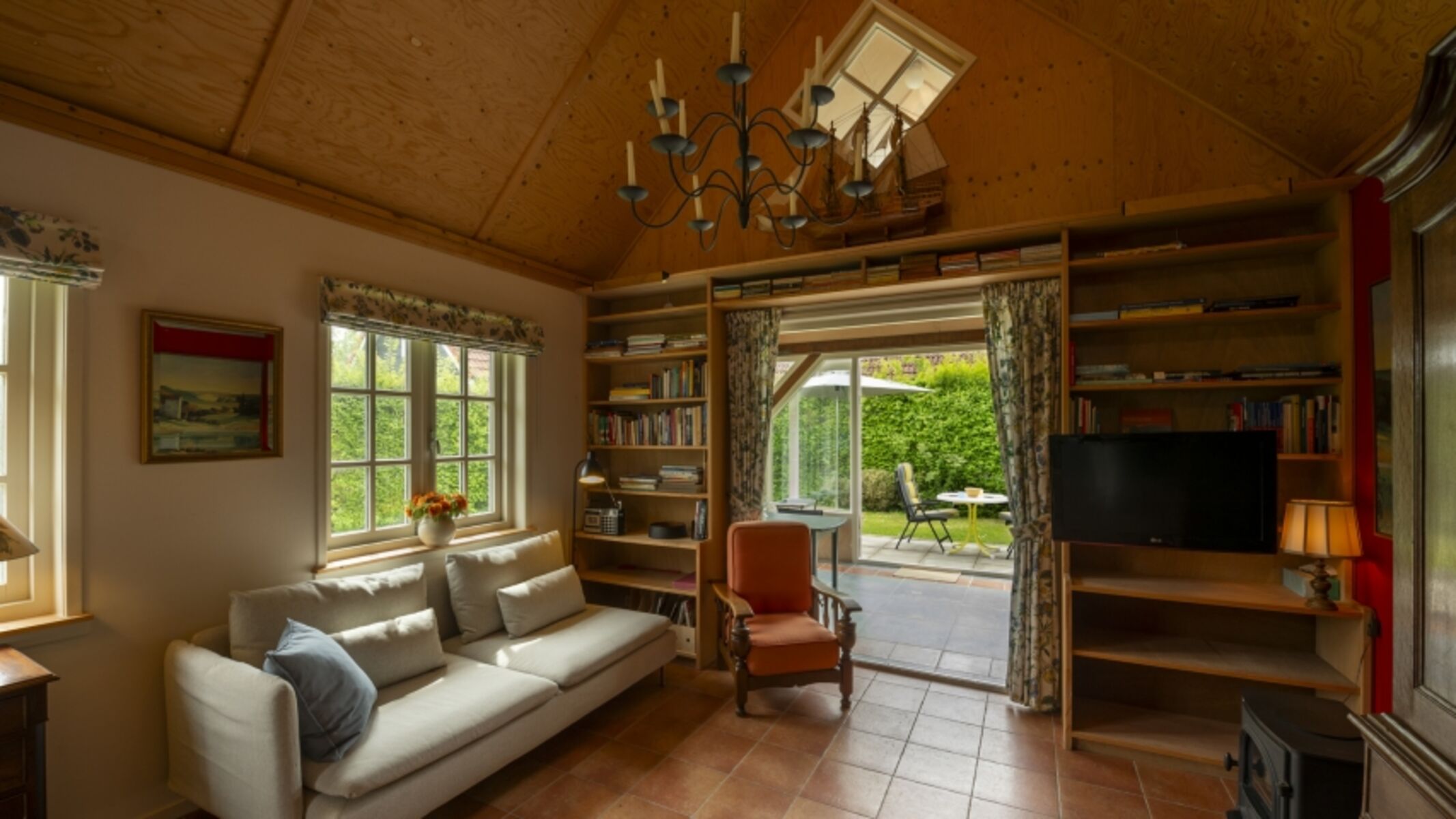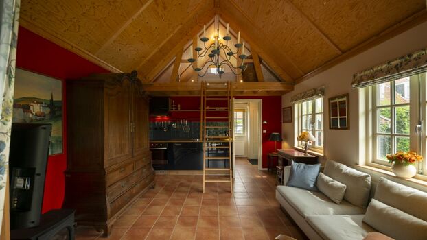 Das Wohnzimmer ist romantisch eingerichtet mit einigen antiken Möbeln und Bücherregalen mit Zeeländischen Büchern. Die offene Küche ist voll ausgestattet.