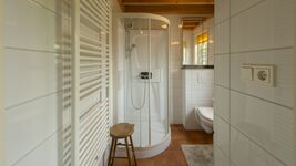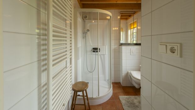 Natürlich gibt es auch ein schönes und modernes Badezimmer mit Dusche, Waschbecken und WC.