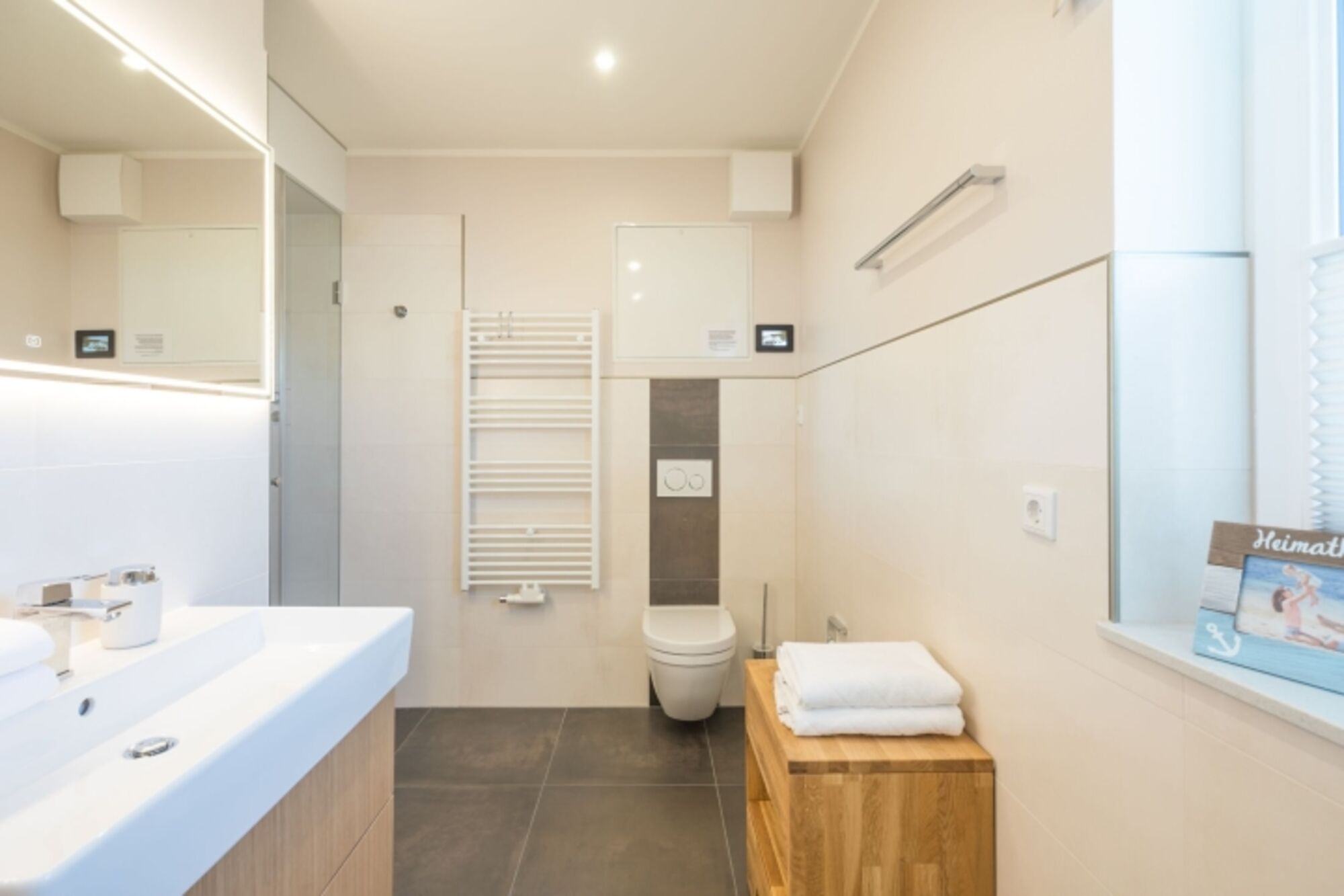 Die Wohnung bietet mit zwei Schlafzimmern Platz für bis zu 4 Personen. Jedes Schlafzimmer ist mit einem Boxspringbett (180 × 200), einem großen Kleiderschrank sowie Verdunklungsmöglichkeiten ausgestattet und hat nicht nur jeweils Zugang zur Dachterrasse, sondern auch ein eigenes Badezimmer mit ebenerdiger Dusche. Eines der Bäder ist zusätzlich mit einer modernen Dampfsauna und auch einem Waschtrockner ausgestattet.