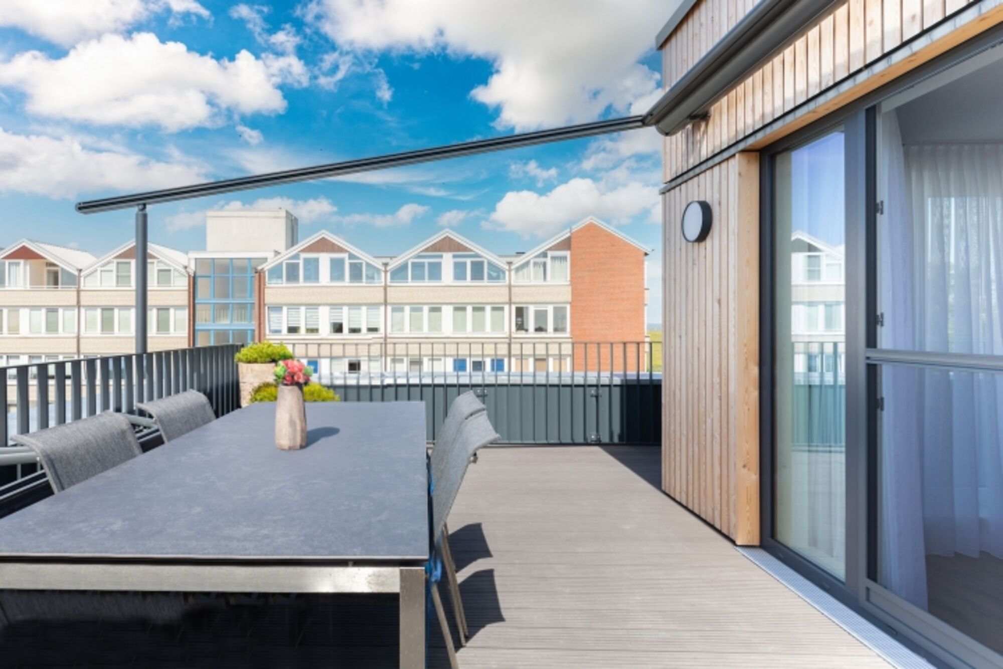 Ein weiteres Highlight dieser Wohnung ist die sonnige Dachterrasse (60 qm) mit exklusiven Gartenmöbeln und einer elektrischen Markise.