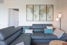 Der großzügige Wohnbereich bietet Ihnen eine bequeme Sofalandschaft mit OLED-Smart-TV, DVD-Player und Musikanlage. Nehmen Sie Platz auf dem Ledersessel und schauen Sie über den Deich auf die Halligen.