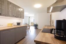 4-Platten Herd, Cerankochfeld, Dunstabzugshaube, Kühlschrank mit Gefrierfach, Gefrierschrank, Korkenzieher / Flaschenöffner, Geschirrhandtücher, Essplatz in der Küche