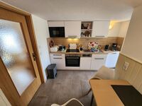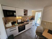4-Platten Herd, Cerankochfeld, Dunstabzugshaube, Kühlschrank mit Gefrierfach, Eierkocher, Korkenzieher / Flaschenöffner, Geschirrhandtücher, Mülltüten, Essplatz in der Küche