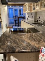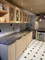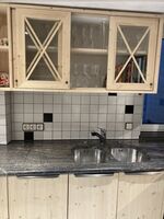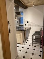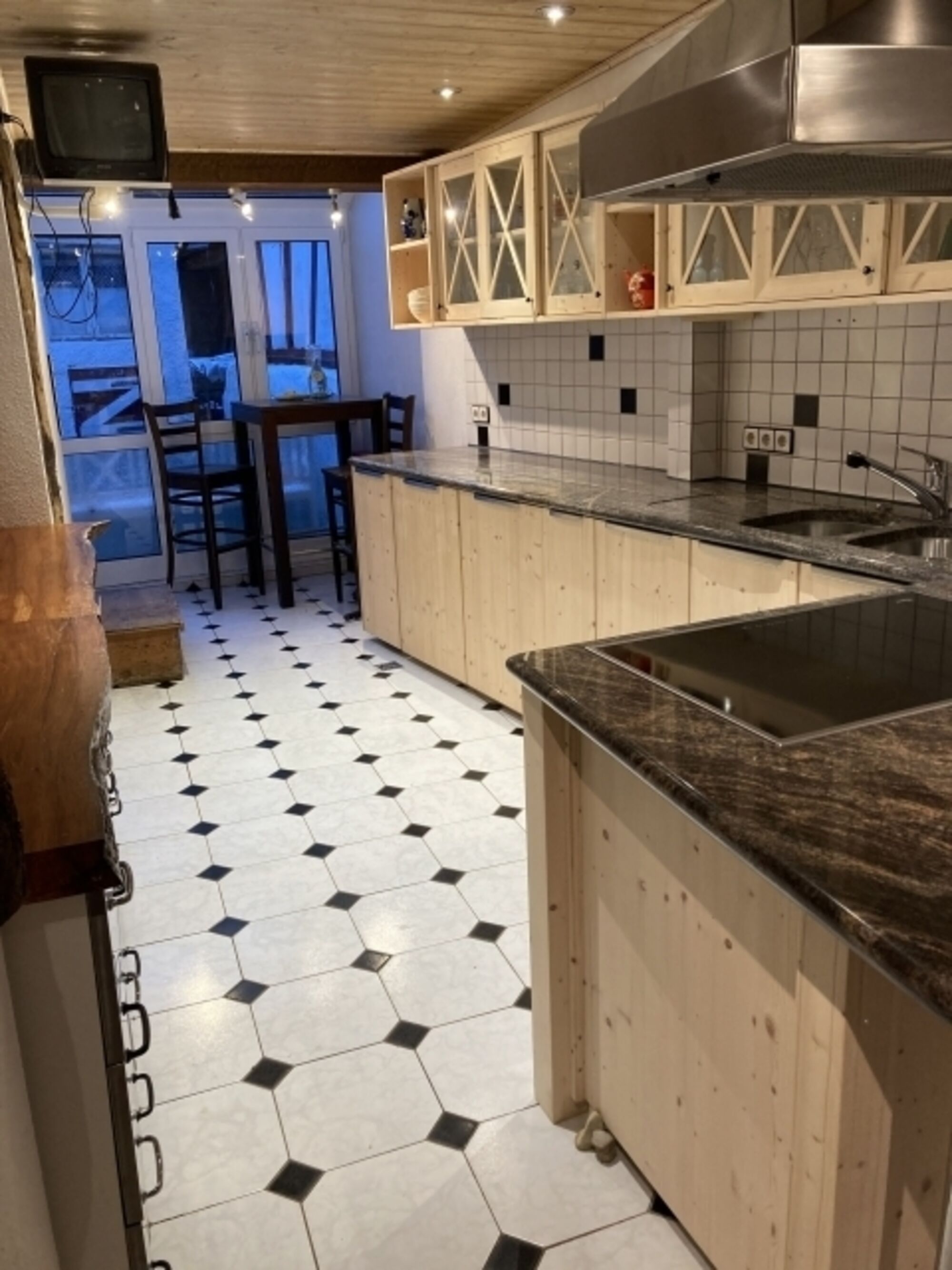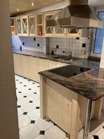 Cerankochfeld, Induktionsherd, Dunstabzugshaube, Kühlschrank mit Gefrierfach, Kaffeevollautomat, Gewürze (Salz, Pfeffer, Zucker), Mülltüten, Essplatz in der Küche