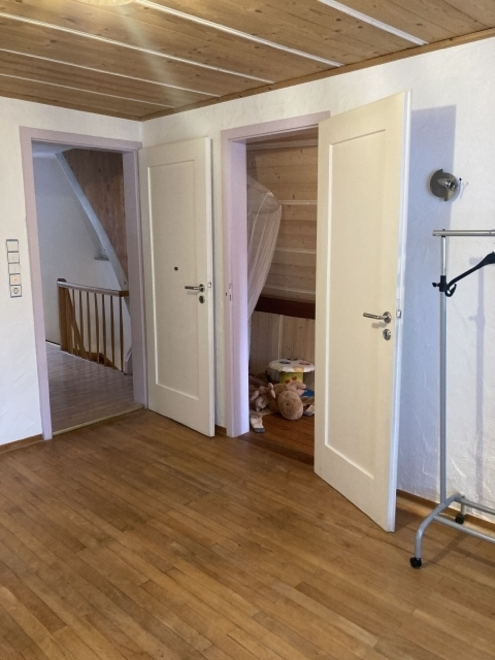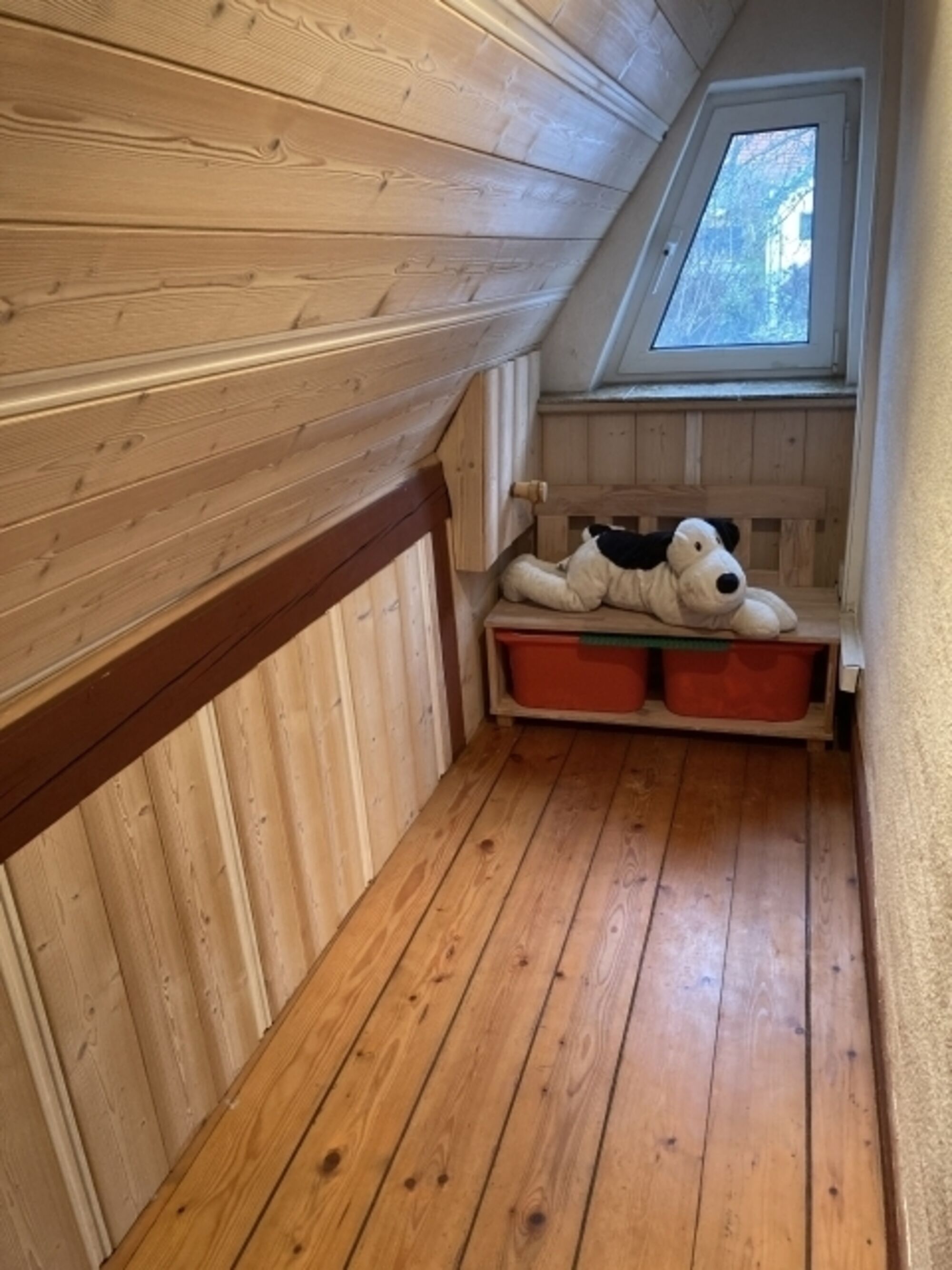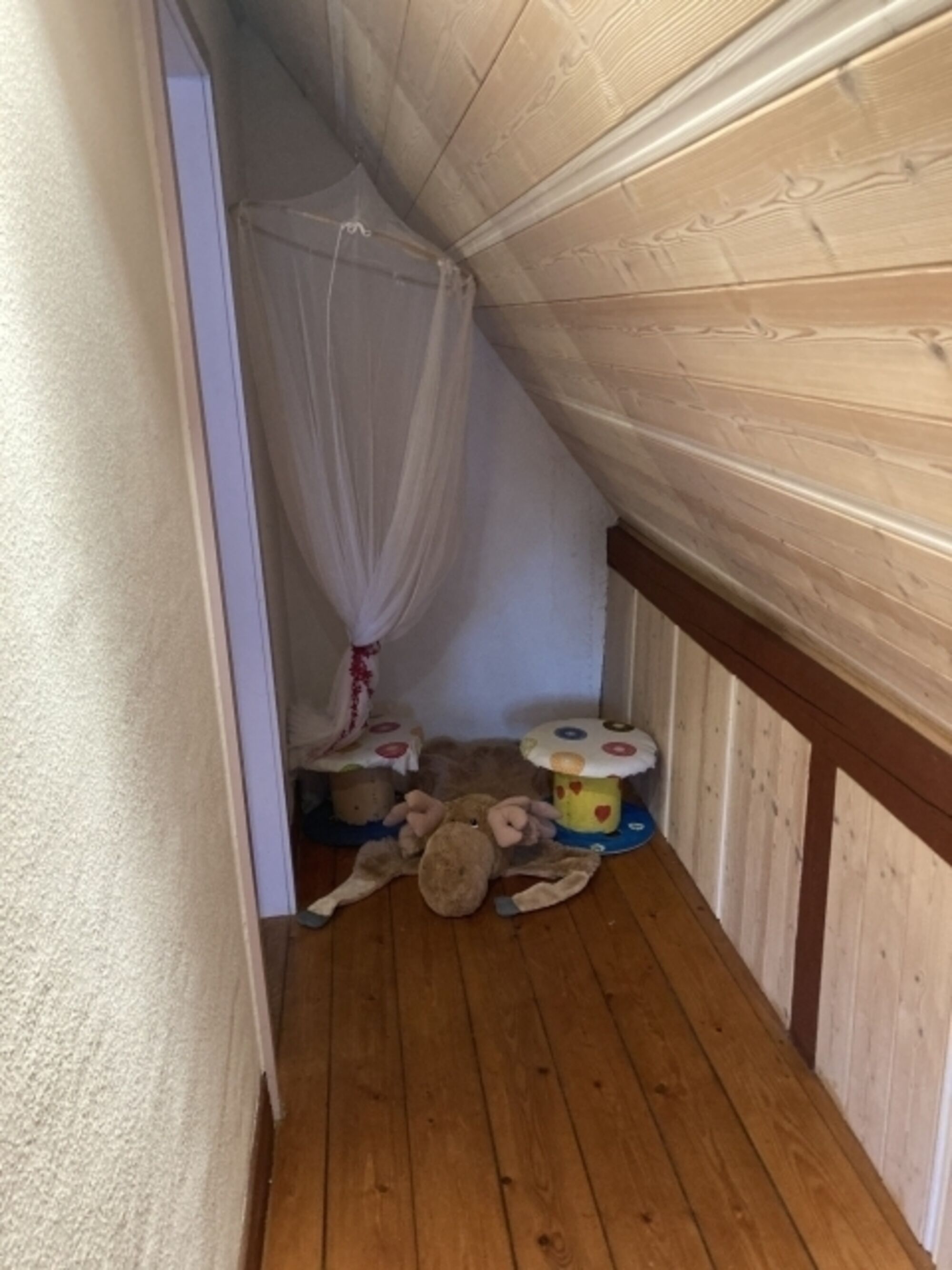 ein Zimmer mit einem Bett 1,20 x 2 m und einem kleinen Kämmerchen mit Kinderbank und Kuschelecke