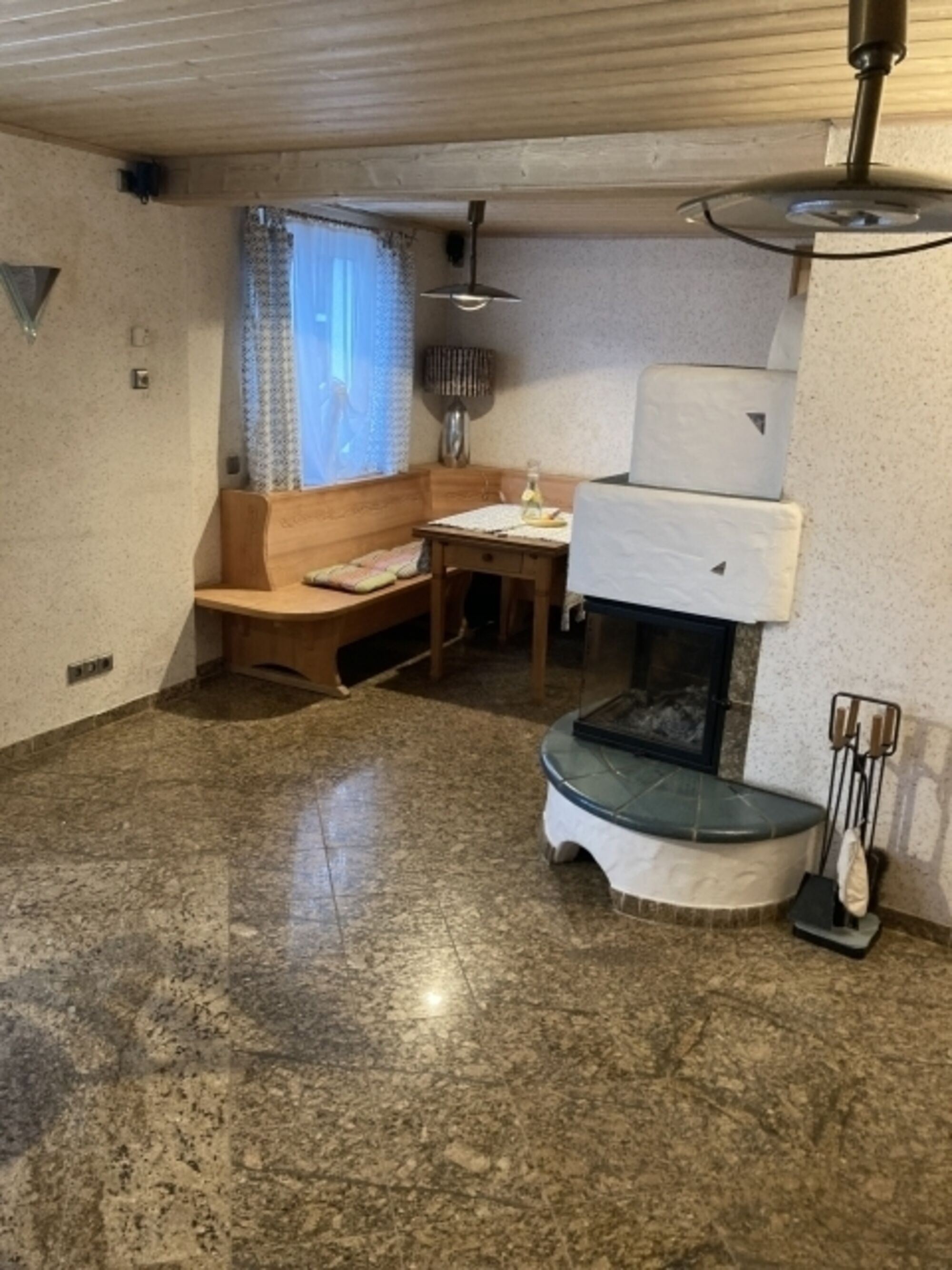Wohn- und Esszimmer, in dem die Couch ein ein Bett 1,20 x 2 m umgewandelt werden kann und Kaminofen