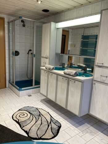 großes Badezimmer mit Eckwanne, Doppelwaschtisch und Dusche