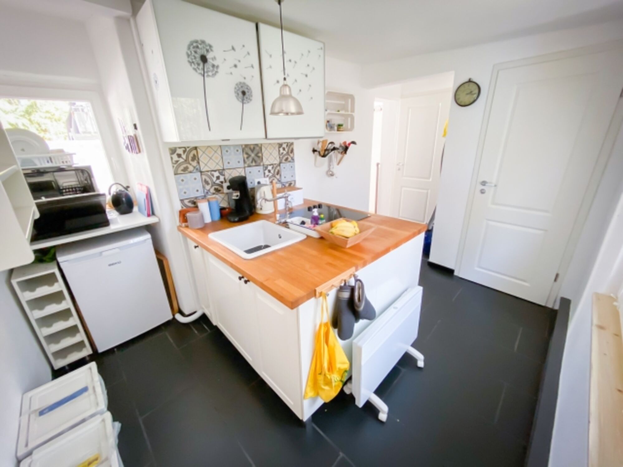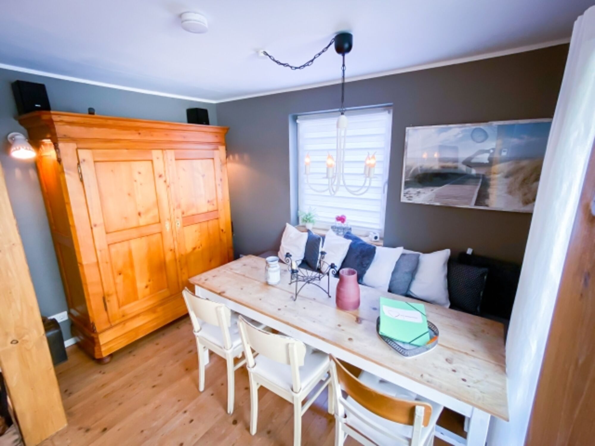 4-Platten Herd, Cerankochfeld, Kühlschrank mit Gefrierfach, Senseo-Kaffeeautomat, Mixer, Korkenzieher / Flaschenöffner, Gewürze (Salz, Pfeffer, Zucker), Öl / Essig
