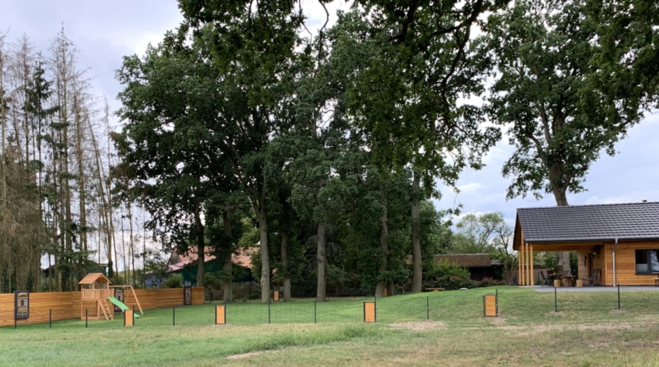 Das Grundstück ist kindersicher eingezäunt und verfügt über einen Spielturm mit Sandkasten, Rutsche und Schaukel.