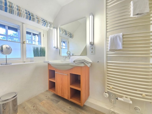 Das Obergeschoss des Hauses verfügt über ein großzügiges Schlafzimmer mit einem Doppelbett (1,80 x 2,00 m) und ein Bad En-Suite, sowie ein zweites Schlafzimmer mit einem Kojen-Bett (1,40 x 2,00 m) im typischen friesischen Stil. Das zweite Schlafzimmer bietet Ihnen ebenfalls ein Bad En-Suite.