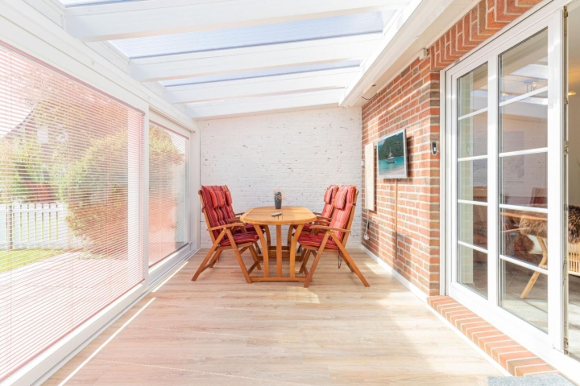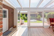 Das sehr geschmackvoll und modern eingerichtete Ferienhaus bietet Platz für bis zu 4 Personen. Im Erdgeschoss finden Sie den großen, lichtdurchfluteten Wohnbereich mit gemütlicher Sitzecke. Hier können Sie es sich auf dem großen Sofa bequem machen und ein internetfähiger Flachbild-TV oder Radio/CD-Player (mit Bluetooth) sorgt für Unterhaltung. Die angrenzende offene Küche mit gemütlichem Essbereich ist sehr gut ausgestattet: Induktionskochfeld, Backofen, Kühl- und Gefrierschrank, Geschirrspülmaschine und eine KRUPS Filterkaffeemaschine (Filtergröße 4). Vom Wohnzimmer aus gelangen Sie in den geräumigen, hellen Wintergarten mit Blick auf den hübschen Garten. Hier steht Ihnen ein weiterer Essbereich und ein Flachbild-TV zur Verfügung. Im Eingangsbereich befindet sich das erste von zwei Duschbädern mit einem WC. Die beiden Schlafzimmer (160 x 200 u. 180 x 200 cm) befinden sich im 1. Obergeschoss der Unterkunft. Im großen Schlafzimmer steht Ihnen ein Flachbild-TV für Ihre Abendunterhaltung und ein kleiner Schreibtisch zur Verfügung. In beiden Schlafzimmern sind große Kleiderschränke mit ausreichend Stauraum vorhanden.